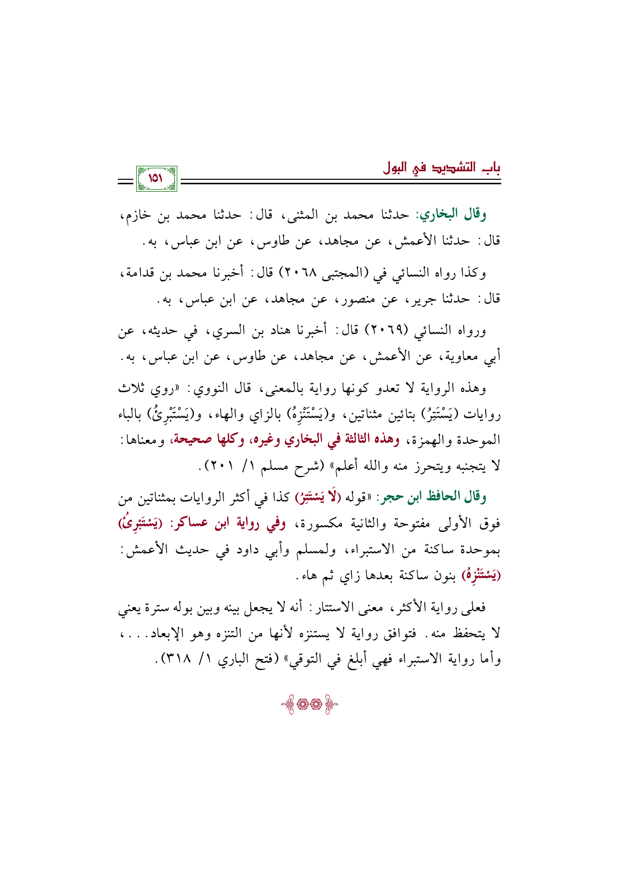 وقال الحافظ ابن حجر: "قوله (لَا يَسْتَتِرُ) كذا في أكثر الروايات بمثناتين من فوق الأولى مفتوحة والثانية مكسورة، وفي رواية ابن عساكر: (يَسْتَبْرِئُ) بموحدة ساكنة من الاستبراء، ولمسلم وأبي داود في حديث الأعمش: (يَسْتَنْزِهُ) بنون ساكنة بعدها زاي ثم هاء.