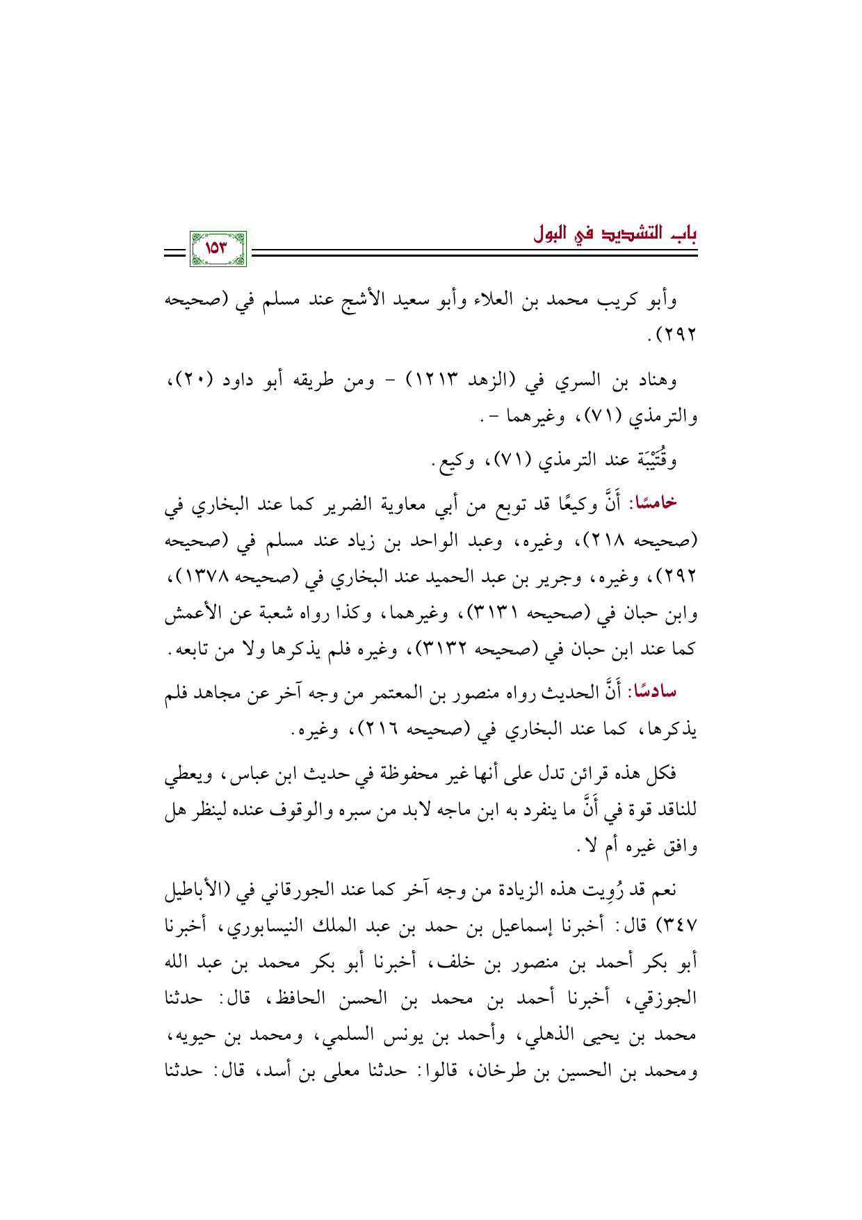 خامسًا: أَنَّ وكيعًا قد توبع من أبي معاوية الضرير كما عند البخاري في (صحيحه ٢١٨)، وغيره، وعبد الواحد بن زياد عند مسلم في (صحيحه ٢٩٢)، وغيره، وجرير بن عبد الحميد عند البخاري في (صحيحه ١٣٧٨)، وابن حبان في (صحيحه ٣١٣١)، وغيرهما، وكذا رواه شعبة عن الأعمش كما عند ابن حبان في (صحيحه ٣١٣٢)، وغيره فلم يذكرها ولا من تابعه.