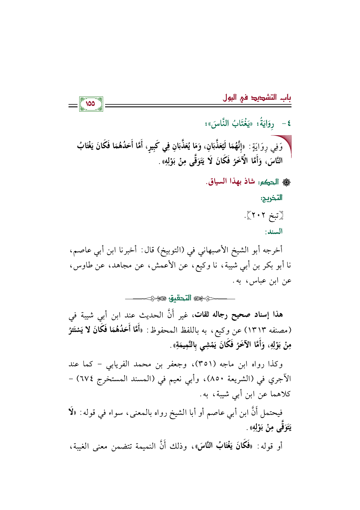 فيحتمل أَنَّ ابن أبي عاصم أو أبا الشيخ رواه بالمعنى، سواء في قوله: «لَا يَتَوَقَّى مِنْ بَوْلِهِ».