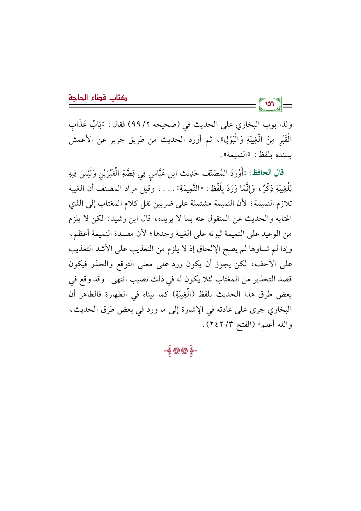 قال الحافظ: "أَوْرَدَ المُصَنّف حَدِيث ابن عَبَّاسٍ فِي قِصَّةِ الْقَبْرَيْنِ وَلَيْسَ فِيهِ لِلْغِيبَةِ ذِكْرٌ، وَإِنَّمَا وَرَدَ بِلَفْظِ: «النَّمِيمَةِ» ... ، وقيل مراد المصنف أن الغيبة تلازم النميمة؛ لأن النميمة مشتملة على ضربين نقل كلام المغتاب إلى الذي اغتابه والحديث عن المنقول عنه بما لا يريده، قال ابن رشيد: لكن لا يلزم من الوعيد على النميمة ثبوته على الغيبة وحدها؛ لأن مفسدة النميمة أعظم، وإذا لم تساوها لم يصح الإلحاق إذ لا يلزم من التعذيب على الأشد التعذيب على الأخف، لكن يجوز أن يكون ورد على معنى التوقع والحذر فيكون قصد التحذير من المغتاب لئلا يكون له في ذلك نصيب انتهى. وقد وقع في بعض طرق هذا الحديث بلفظ (الْغِيبَةِ) كما بيناه في الطهارة فالظاهر أن البخاري جرى على عادته في الإشارة إلى ما ورد في بعض طرق الحديث، والله أعلم" (الفتح ٣/ ٢٤٢).