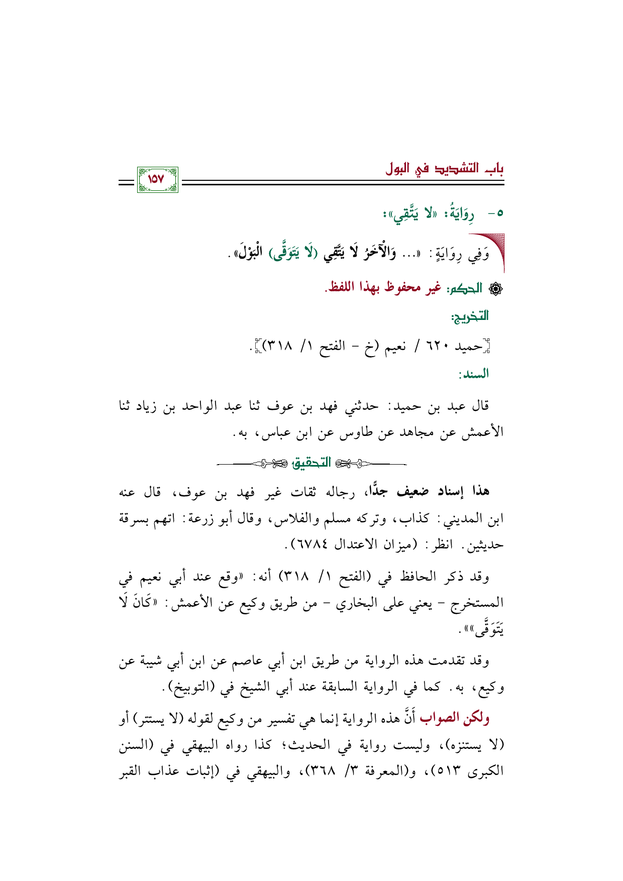 ولكن الصواب أَنَّ هذه الرواية إنما هي تفسير من وكيع لقوله (لا يستتر) أو (لا يستنزه)، وليست رواية في الحديث؛ كذا رواه البيهقي في (السنن الكبرى ٥١٣)، و (المعرفة ٣/ ٣٦٨)، والبيهقي في (إثبات عذاب القبر