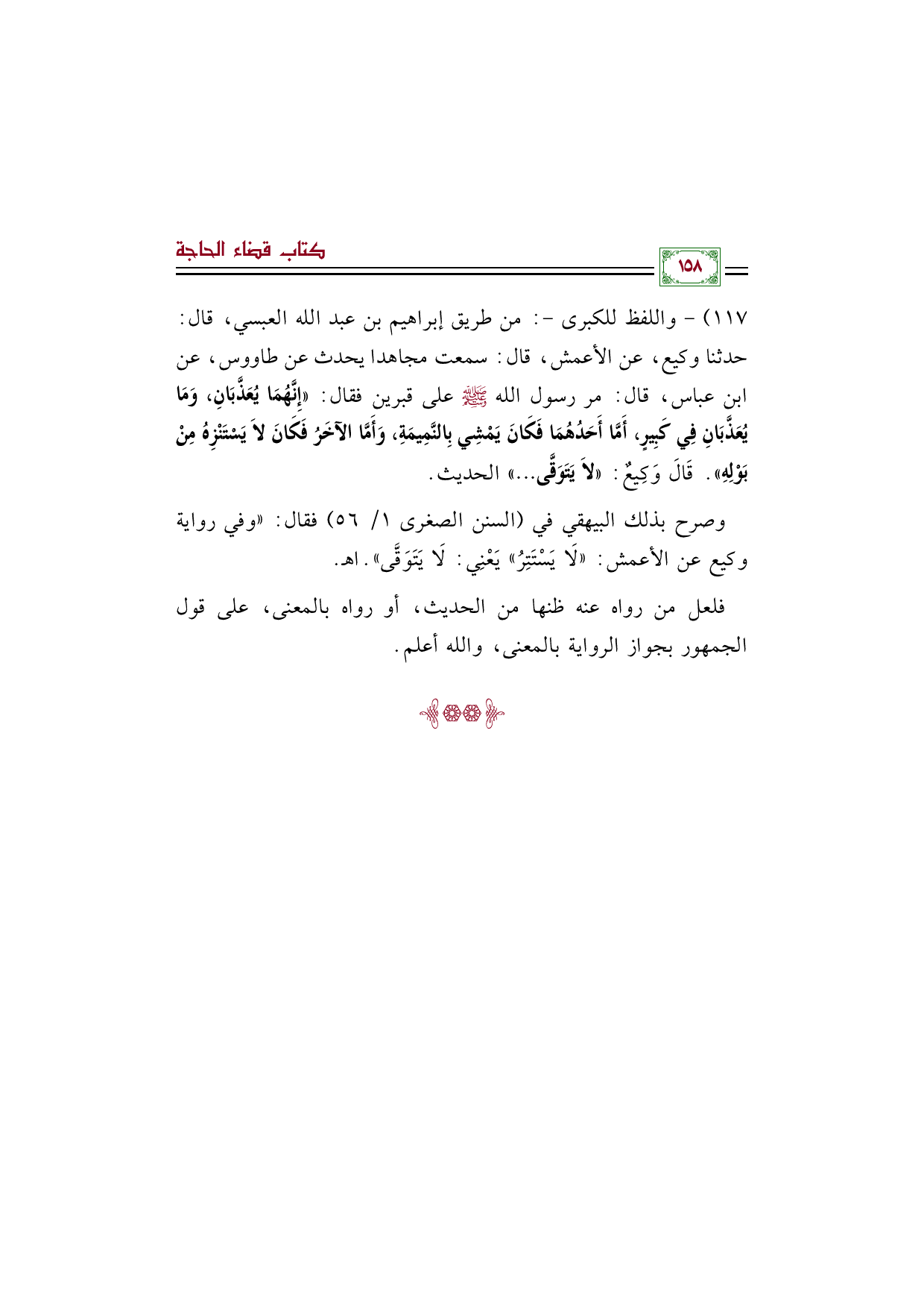 ١١٧) - واللفظ للكبرى -: من طريق إبراهيم بن عبد الله العبسي، قال: حدثنا وكيع، عن الأعمش، قال: سمعت مجاهدا يحدث عن طاووس، عن ابن عباس، قال: مر رسول الله صلى الله عليه وسلم على قبرين فقال: «إِنَّهُمَا يُعَذَّبَانِ، وَمَا يُعَذَّبَانِ فِي كَبِيرٍ، أَمَّا أَحَدُهُمَا فَكَانَ يَمْشِي بِالنَّمِيمَةِ، وَأَمَّا الآخَرُ فَكَانَ لا يَسْتَنْزِهُ مِنْ بَوْلِهِ». قَالَ وَكِيعٌ: لا يَتَوَقَّى ... الحديث.