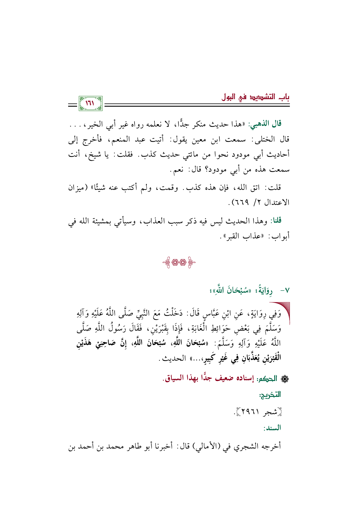 قلنا: وهذا الحديث ليس فيه ذكر سبب العذاب، وسيأتي بمشيئة الله في أبواب: "عذاب القبر".