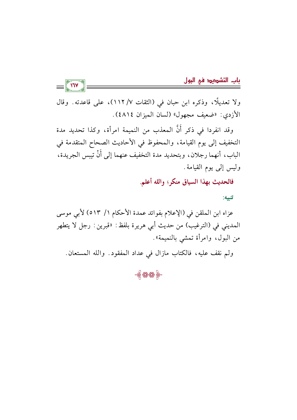 وقد انفردا في ذكر أَنَّ المعذب من النميمة امرأة، وكذا تحديد مدة التخفيف إلى يوم القيامة، والمحفوظ في الأحاديث الصحاح المتقدمة في الباب، أنهما رجلان، وبتحديد مدة التخفيف عنهما إلى أَنْ تيبس الجريدة، وليس إلى يوم القيامة.