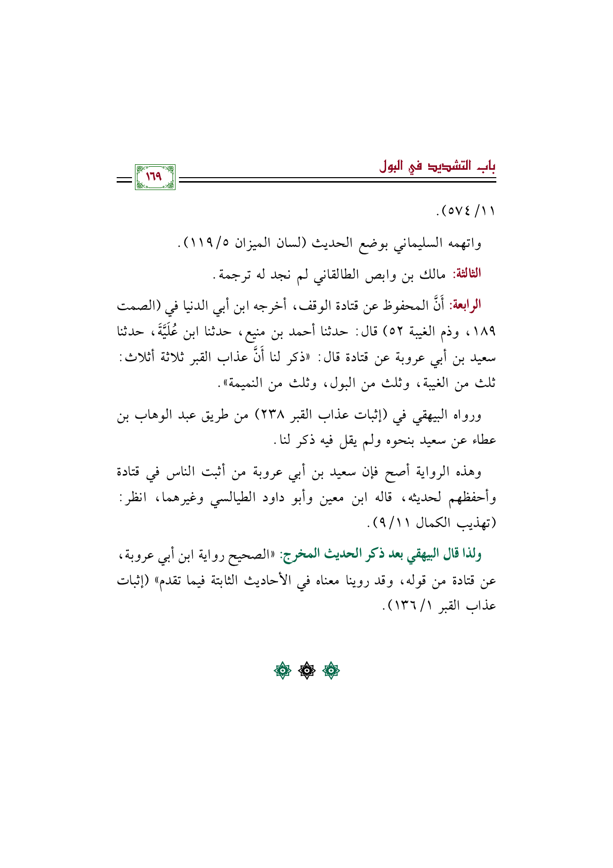 الرابعة: أَنَّ المحفوظ عن قتادة الوقف، أخرجه ابن أبي الدنيا في (الصمت ١٨٩، وذم الغيبة ٥٢) قال: حدثنا أحمد بن منيع، حدثنا ابن عُلَيَّةَ، حدثنا سعيد بن أبي عروبة عن قتادة قال: "ذكر لنا أَنَّ عذاب القبر ثلاثة أثلاث: ثلث من الغيبة، وثلث من البول، وثلث من النميمة".