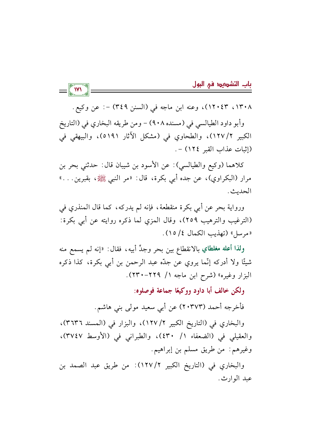 ولذا أعله مغلطاي بالانقطاع بين بحر وجدِّ أبيه، فقال: "إنه لم يسمع منه شيئًا ولا أدركه إنّما يروي عن جدّه عبد الرحمن بن أبي بكرة، كذا ذكره البزار وغيره" (شرح ابن ماجه ١/ ٢٢٩ - ٢٣٠).
