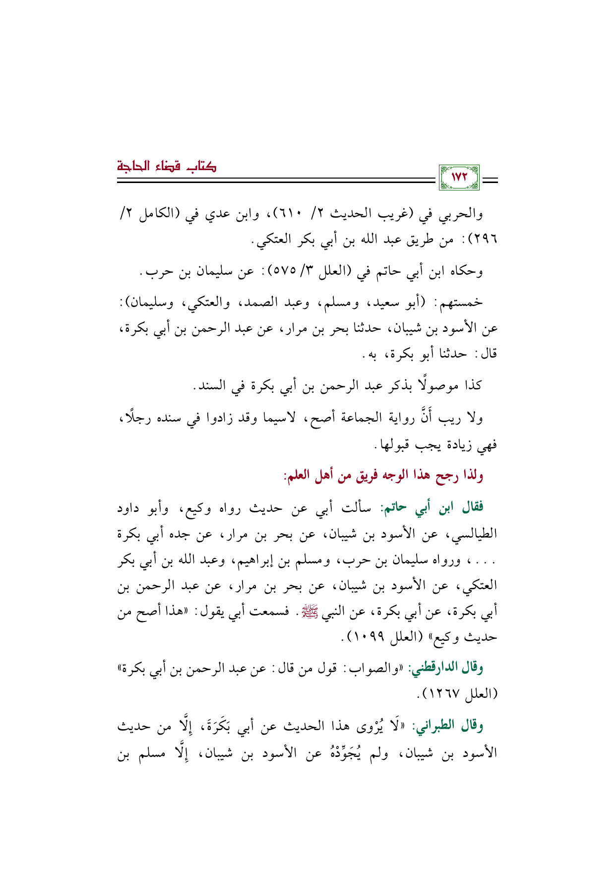 فقال ابن أبي حاتم: سألت أبي عن حديث رواه وكيع، وأبو داود الطيالسي، عن الأسود بن شيبان، عن بحر بن مرار، عن جده أبي بكرة ..... ، ورواه سليمان بن حرب، ومسلم بن إبراهيم، وعبد الله بن أبي بكر العتكي، عن الأسود بن شيبان، عن بحر بن مرار، عن عبد الرحمن بن أبي بكرة، عن أبي بكرة، عن النبي صلى الله عليه وسلم. فسمعت أبي يقول: "هذا أصح من حديث وكيع" (العلل ١٠٩٩).