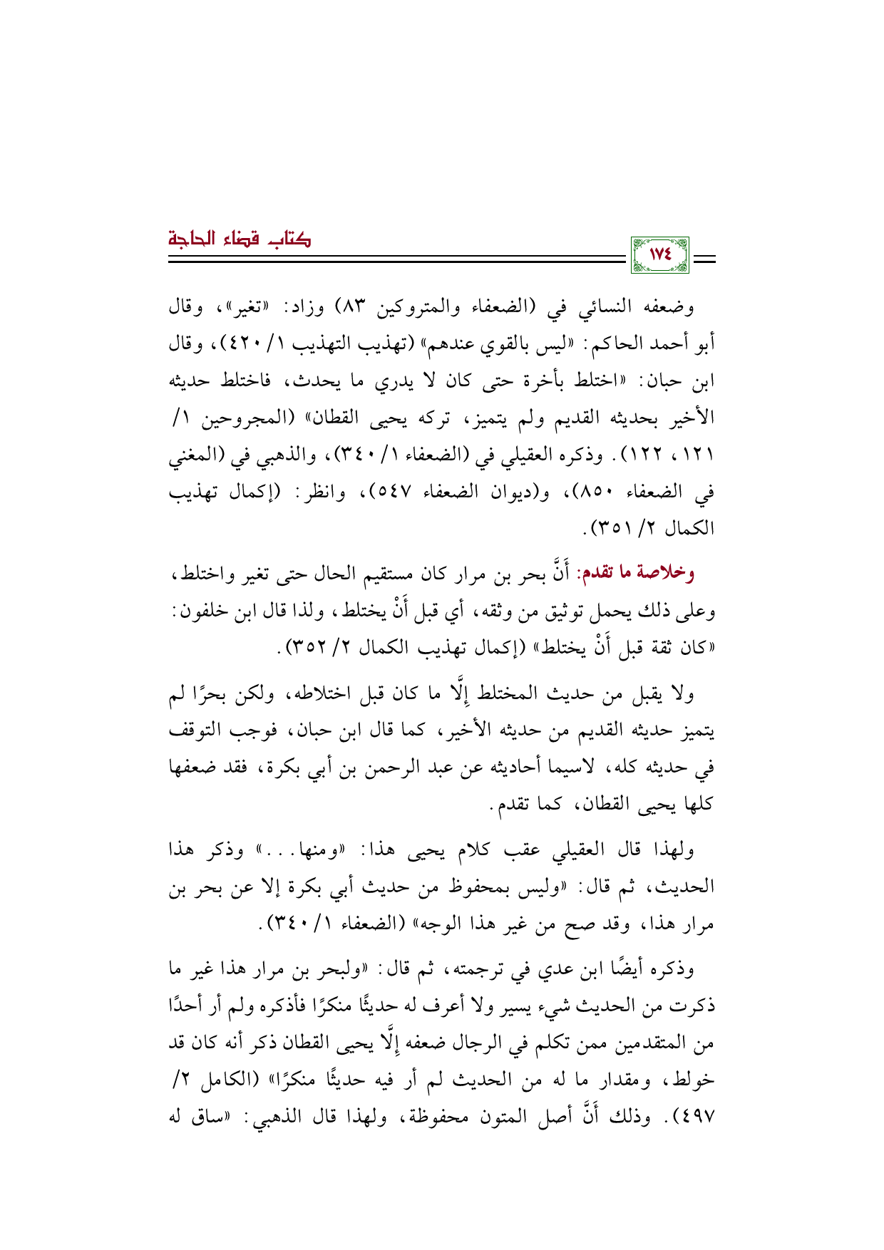 وخلاصة ما تقدم: أَنَّ بحر بن مرار كان مستقيم الحال حتى تغير واختلط، وعلى ذلك يحمل توثيق من وثقه، أي قبل أَنْ يختلط، ولذا قال ابن خلفون: "كان ثقة قبل أَنْ يختلط" (إكمال تهذيب الكمال ٢/ ٣٥٢).