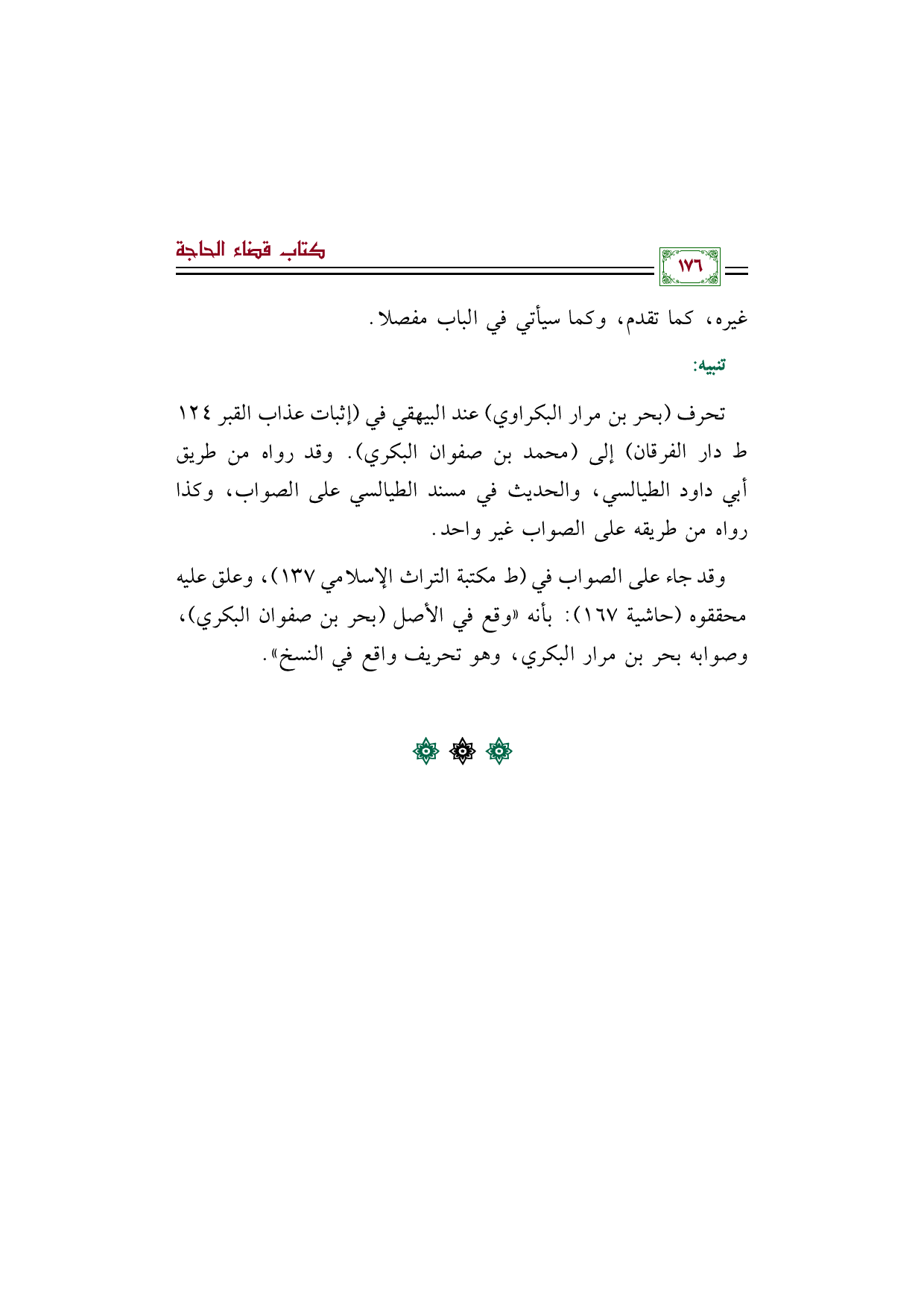 تحرف (بحر بن مرار البكراوي) عند البيهقي في (إثبات عذاب القبر ١٢٤ ط دار الفرقان) إلى (محمد بن صفوان البكري). وقد رواه من طريق أبي داود الطيالسي، والحديث في مسند الطيالسي على الصواب، وكذا رواه من طريقه على الصواب غير واحد.