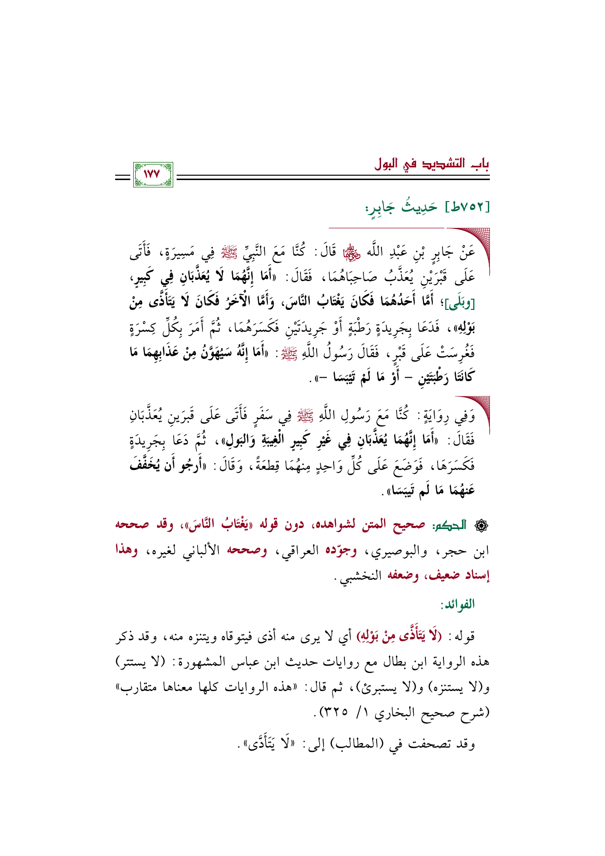 قوله (لَا يَتَأَذَّى مِنْ بَوْلِهِ) أي لا يرى منه أذى فيتوقاه ويتنزه منه، وقد ذكر هذه الرواية ابن بطال مع روايات حديث ابن عباس المشهورة: (لا يستتر) و (لا يستنزه) و (لا يستبرئ)، ثم قال: "هذه الروايات كلها معناها متقارب" (شرح صحيح البخاري ١/ ٣٢٥).