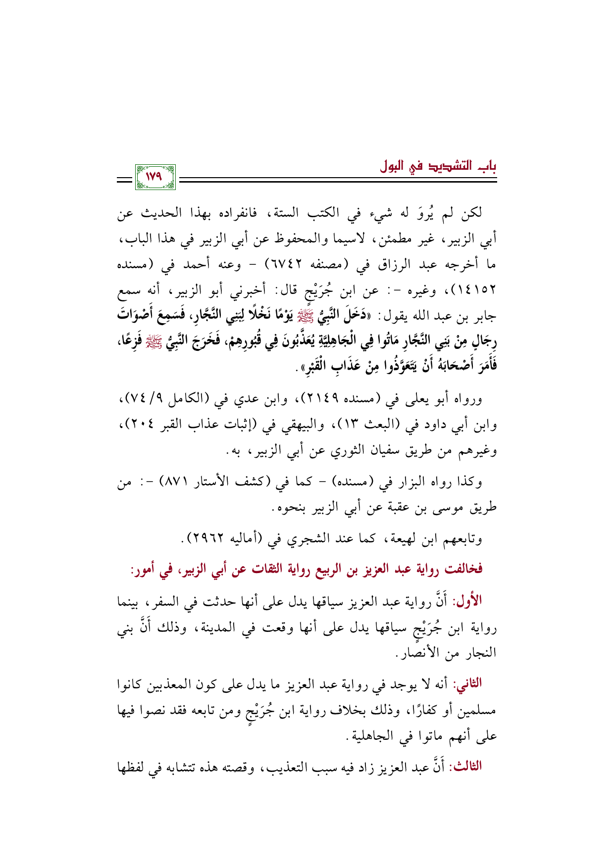 لكن لم يُروَ له شيء في الكتب الستة، فانفراده بهذا الحديث عن أبي الزبير، غير مطمئن، لاسيما والمحفوظ عن أبي الزبير في هذا الباب، ما أخرجه عبد الرزاق في (مصنفه ٦٧٤٢) - وعنه أحمد في (مسنده ١٤١٥٢)، وغيره -: عن ابن جُرَيْجٍ قال: أخبرني أبو الزبير، أنه سمع جابر بن عبد الله يقول: «دَخَلَ النَّبِيُّ صَلَّى اللهُ عَلَيْهِ وَسَلَّمَ يَوْمًا نَخْلًا لِبَنِي النَّجَّارِ، فَسَمِعَ أَصْوَاتَ رِجَالٍ مِنْ بَنِي النَّجَّارِ مَاتُوا فِي الْجَاهِلِيَّةِ يُعَذَّبُونَ فِي قُبُورِهِمْ، فَخَرَجَ النَّبِيُّ صَلَّى اللهُ عَلَيْهِ وَسَلَّمَ فَزِعًا، فَأَمَرَ أَصْحَابَهُ أَنْ يَتَعَوَّذُوا مِنْ عَذَابِ الْقَبْرِ».