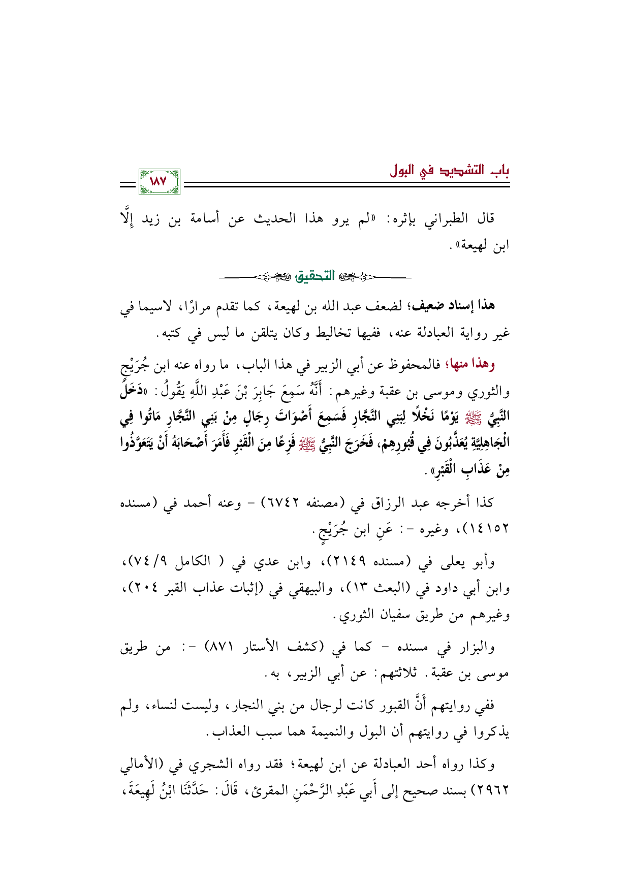 ففي روايتهم أَنَّ القبور كانت لرجال من بني النجار، وليست لنساء، ولم يذكروا في روايتهم أن البول والنميمة هما سبب العذاب.