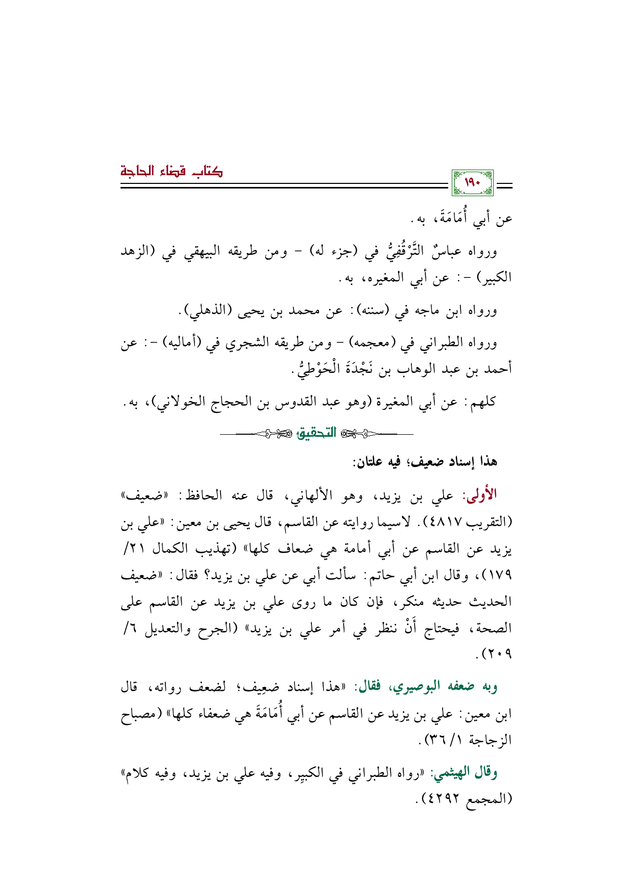 وبه ضعفه البوصيري، فقال: "هذا إسناد ضعِيف؛ لضعف رواته، قال ابن معين: علي بن يزيد عن القاسم عن أبي أُمَامَةَ هي ضعفاء كلها" (مصباح الزجاجة ١/ ٣٦).