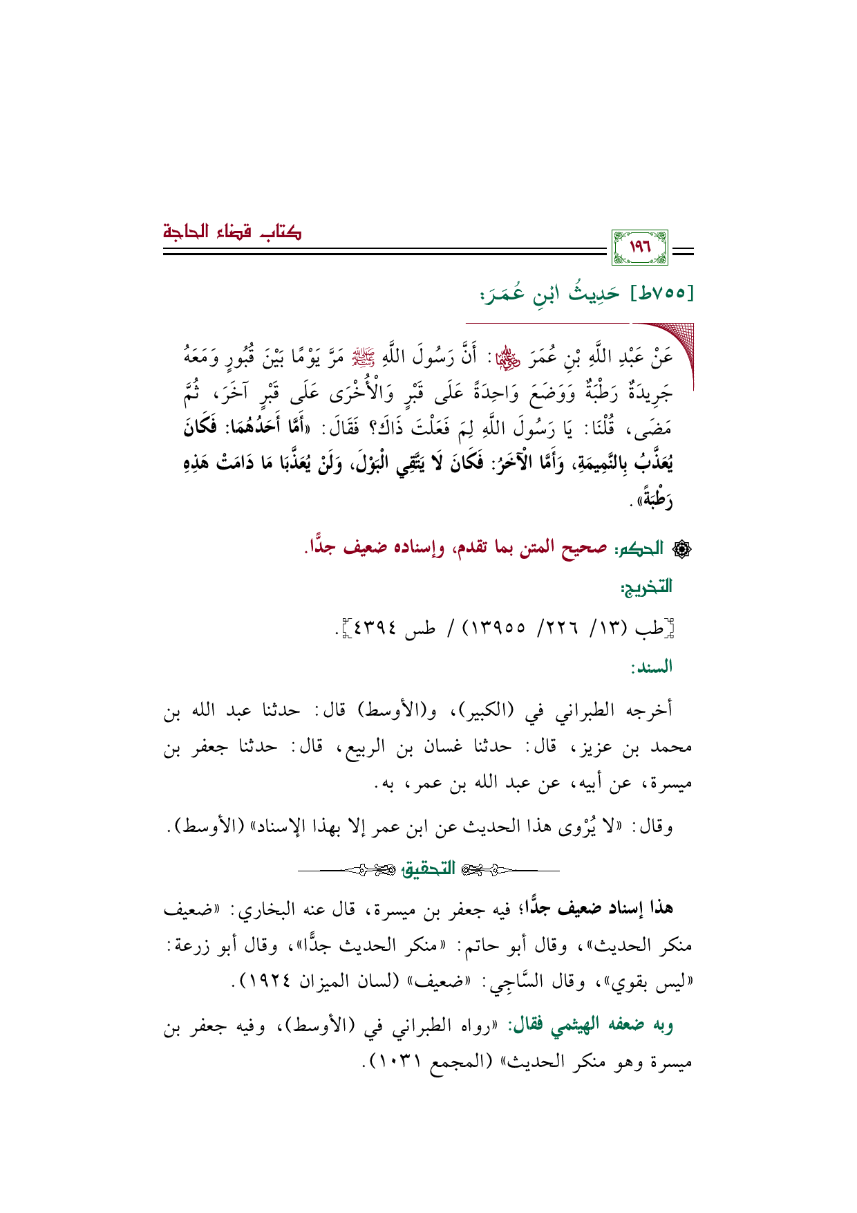 أخرجه الطبراني في (الكبير)، و (الأوسط) قال: حدثنا عبد الله بن محمد بن عزيز، قال: حدثنا غسان بن الربيع، قال: حدثنا جعفر بن ميسرة، عن أبيه، عن عبد الله بن عمر، به.