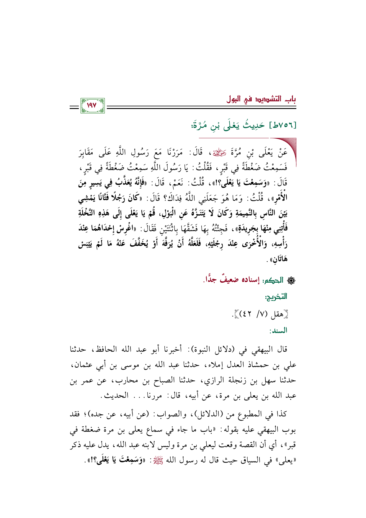 كذا في المطبوع من الدلائل، والصواب: (عن أبيه، عن جده)؛ فقد بوب البيهقي عليه بقوله: "باب ما جاء في سماع يعلى بن مرة ضغطة في قبر"، أي أن القصة وقعت ليعلي بن مرة وليس لابنه عبد الله، يدل عليه ذكر " يعلى " في السياق حيث قال له رسول الله صلى الله عليه وسلم: «وَسَمِعْتَ يَا يَعْلَى؟ ! ».