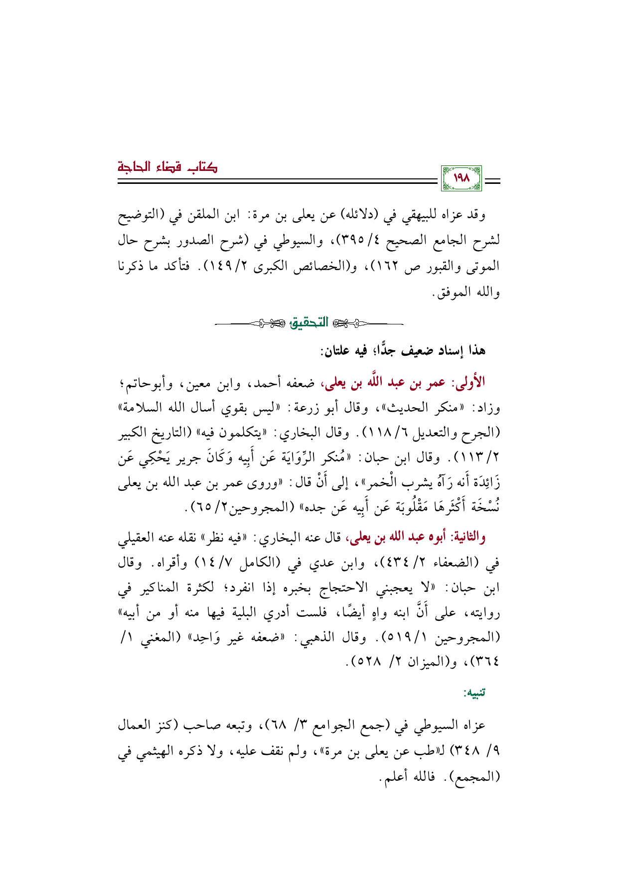 والثانية: أبوه عبد الله بن يعلى، قال عنه البخاري: "فيه نظر" نقله عنه العقيلي في (الضعفاء ٢/ ٤٣٤)، وابن عدي في (الكامل ٧/ ١٤) وأقراه. وقال ابن حبان: "لا يعجبني الاحتجاج بخبره إذا انفرد؛ لكثرة المناكير في روايته، على أَنَّ ابنه واهٍ أيضًا، فلست أدري البلية فيها منه أو من أبيه" (المجروحين ١/ ٥١٩). وقال الذهبي: "ضعفه غير وَاحِد" (المغني ١/ ٣٦٤)، و (الميزان ٢/ ٥٢٨).