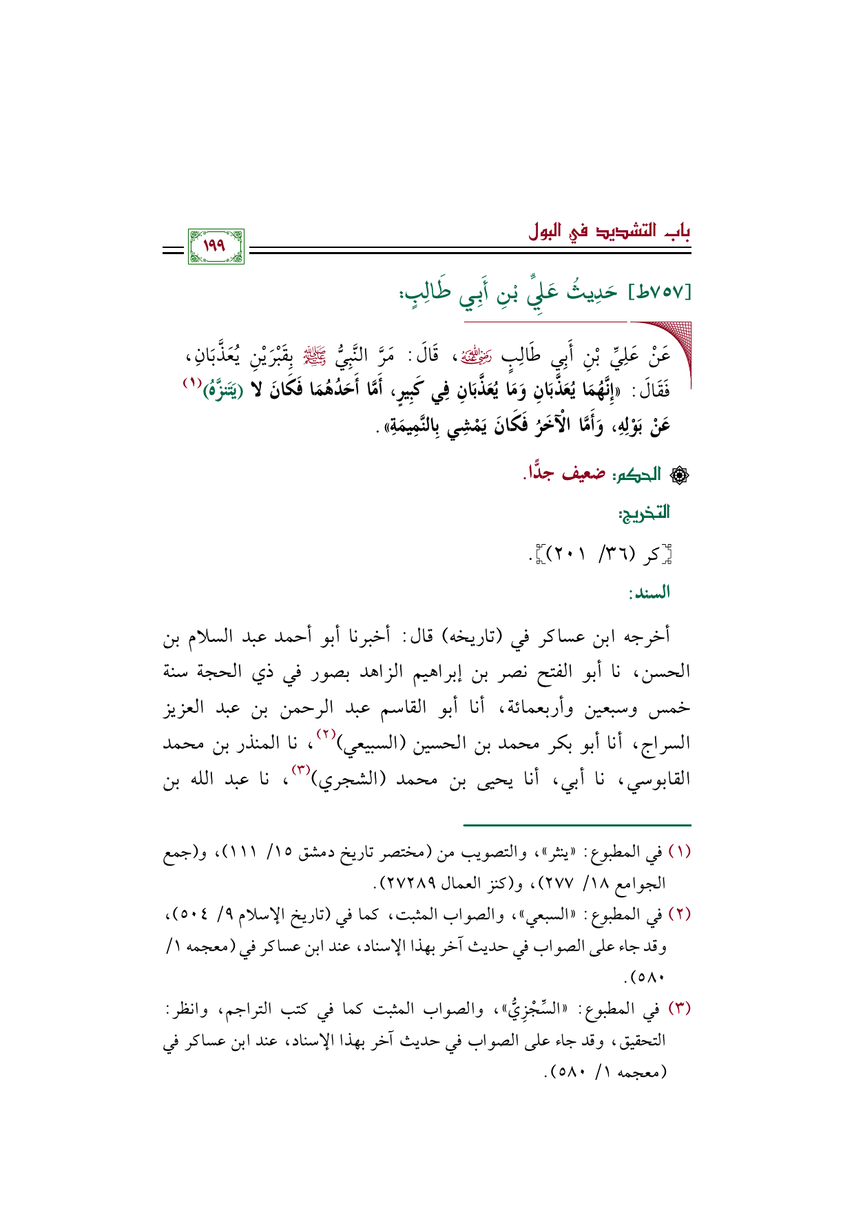 ◼ عَنْ عَلِيِّ بْنِ أَبِي طَالِبٍ رضي الله عنه، قَالَ: مَرَّ النَّبِيُّ صلى الله عليه وسلم بِقَبْرَيْنِ يُعَذَّبَانِ، فَقَالَ: «إِنَّهُمَا يُعَذَّبَانِ وَمَا يُعَذَّبَانِ فِي كَبِيرٍ، أَمَّا أَحَدُهُمَا فَكَانَ لا (يَتَنزَّهُ) (¬١) عَنْ بَوْلِهِ، وَأَمَّا الْآخَرُ فَكَانَ يَمْشِي بِالنَّمِيمَةِ».