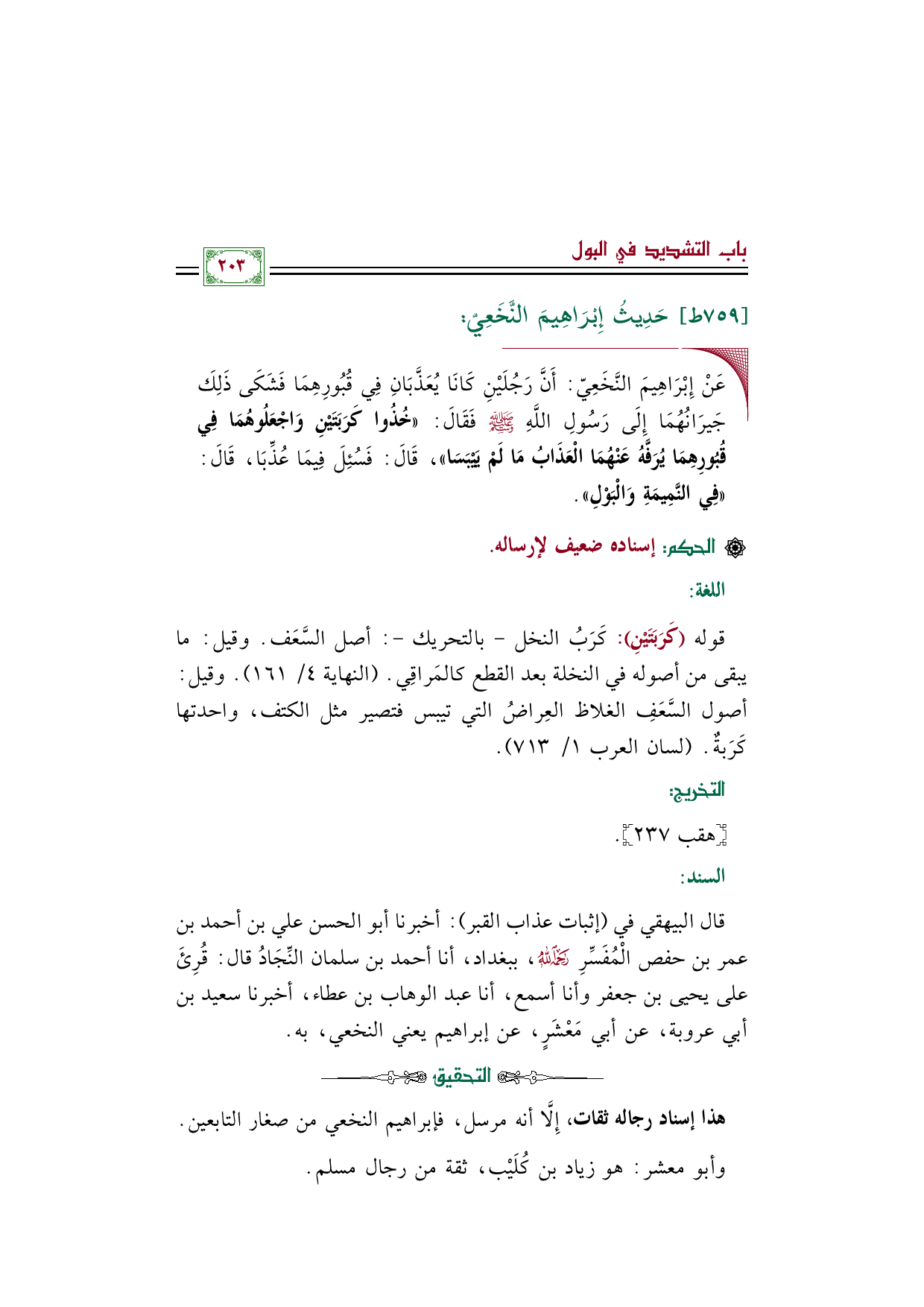 قال البيهقي في (إثبات عذاب القبر): أخبرنا أبو الحسن علي بن أحمد بن عمر بن حفص الْمُفَسِّرِ رحمه الله، ببغداد، أنا أحمد بن سلمان النِّجَادُ قال: قُرِئَ على يحيى بن جعفر وأنا أسمع، أنا عبد الوهاب بن عطاء، أخبرنا سعيد بن أبي عروبة، عن أبي مَعْشَرٍ، عن إبراهيم يعني النخعي، به.