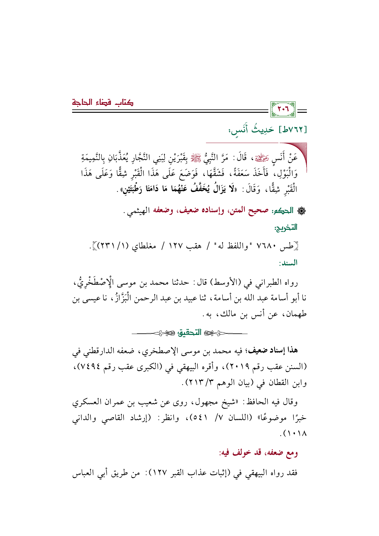 رواه الطبراني في (الأوسط) قال: حدثنا محمد بن موسى الْإِصْطَخْرِيُّ، نا أبو أسامة عبد الله بن أسامة، ثنا عبيد بن عبد الرحمن الْبَزَّازُ، نا عيسى بن طهمان، عن أنس بن مالك، به.