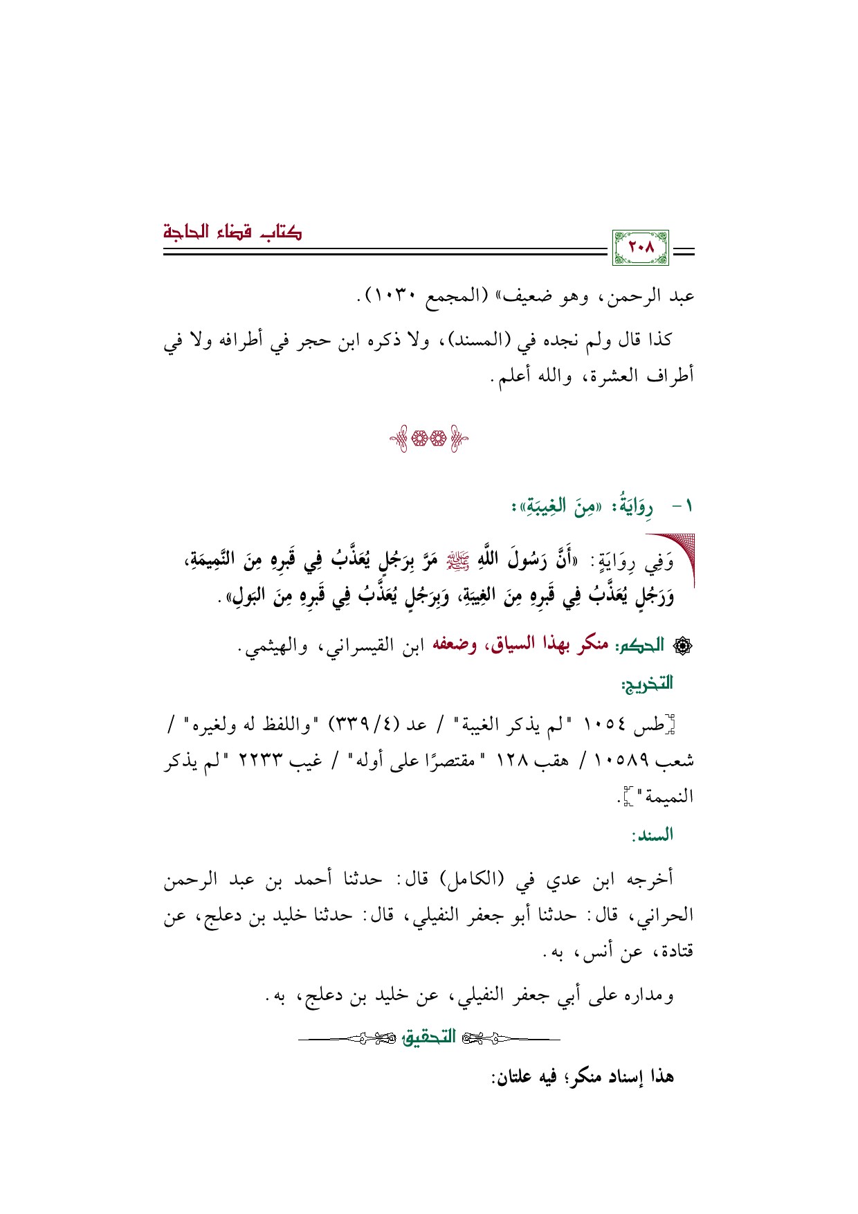 • وَفِي رِوَايَةٍ: «أَنَّ رَسُولَ اللَّهِ صلى الله عليه وسلم مَرَّ بِرَجُلٍ يُعَذَّبُ فِي قَبرِهِ مِنَ النَّمِيمَةِ، وَرَجُلٍ يُعَذَّبُ فِي قَبرِهِ مِنَ الغِيبَةِ، وَبِرَجُلٍ يُعَذَّبُ فِي قَبرِهِ مِنَ البَولِ».