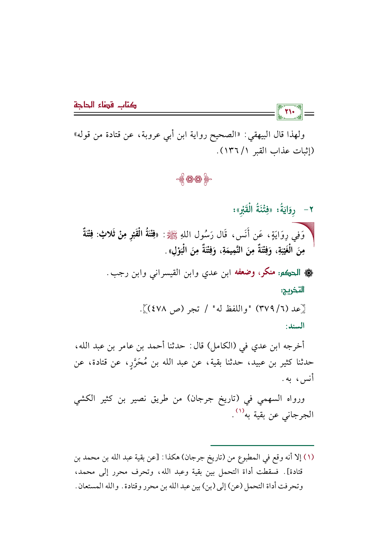 (¬١) إلا أنه وقع في المطبوع من "تاريخ جرجان" هكذا: [عن بقية عبد الله بن محمد بن قتادة]. فسقطت أداة التحمل بين بقية وعبد الله، وتحرف محرر إلى محمد، وتحرفت أداة التحمل (عن) إلى (بن) بين عبد الله بن محرر وقتادة. والله المستعان.