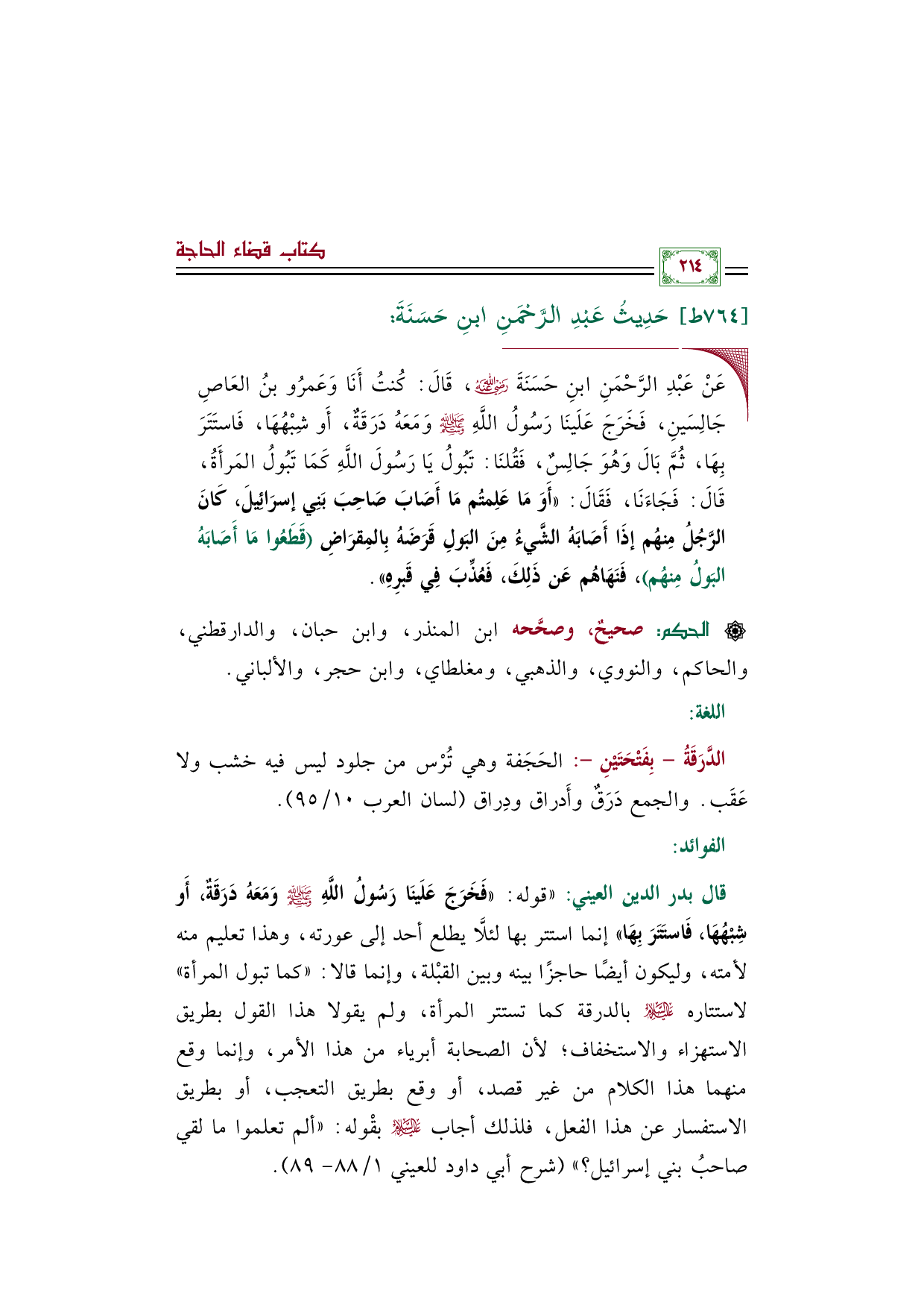 قال بدر الدين العيني: "قوله: "فَخَرَجَ عَلَينَا رَسُولُ اللَّهِ صلى الله عليه وسلم وَمَعَهُ دَرَقَةٌ، أَو شِبْهُهَا، فَاستَتَرَ بِهَا" إنما استتر بها لئلَّا يطلع أحد إلى عورته، وهذا تعليم منه لأمته، وليكون أيضًا حاجزًا بينه وبين القبْلة، وإنما قالا: " كما تبول المرأة " لاستتاره - عليه السلام - بالدرقة كما تستتر المرأة، ولم يقولا هذا القول بطريق الاستهزاء والاستخفاف؛ لأن الصحابة أبرياء من هذا الأمر، وإنما وقع منهما هذا الكلام من غير قصد، أو وقع بطريق التعجب، أو بطريق الاستفسار عن هذا الفعل، فلذلك أجاب - عليه السلام - بقْوله: " ألم تعلموا ما لقي صاحبُ بني إسرائيل؟ " (شرح أبي داود للعيني ١/ ٨٨ - ٨٩).