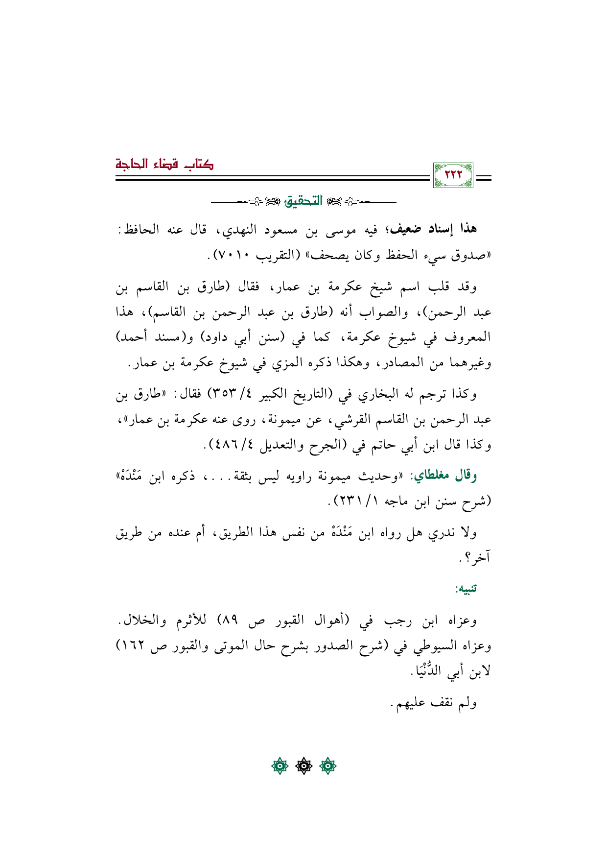 وقد قلب اسم شيخ عكرمة بن عمار، فقال (طارق بن القاسم بن عبد الرحمن)، والصواب أنه (طارق بن عبد الرحمن بن القاسم)، هذا المعروف في شيوخ عكرمة، كما في سنن أبي داود ومسند أحمد وغيرهما من المصادر، وهكذا ذكره المزي في شيوخ عكرمة بن عمار.