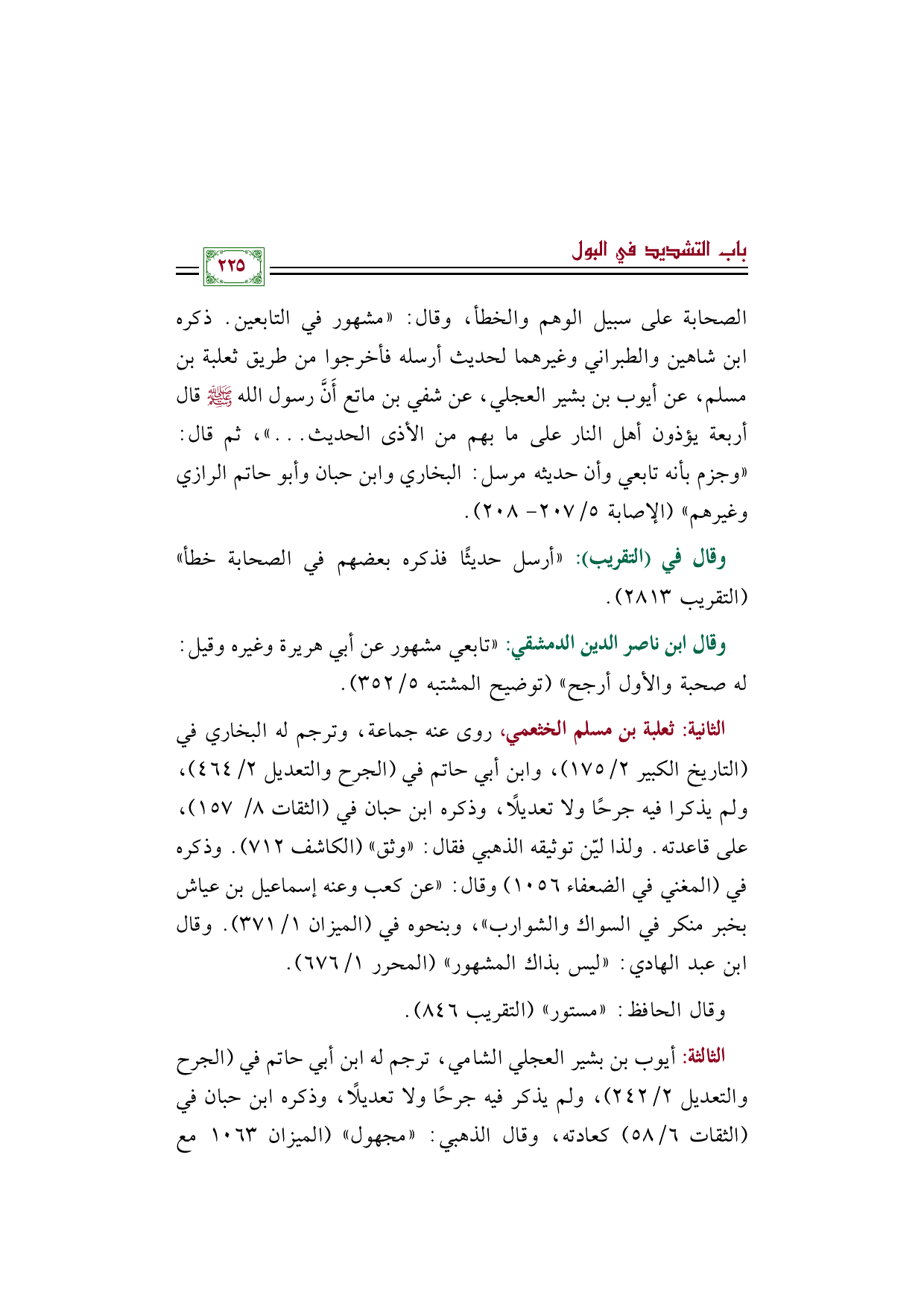 الثانية: ثعلبة بن مسلم الخثعمي، روى عنه جماعة، وترجم له البخاري في (التاريخ الكبير ٢/ ١٧٥)، وابن أبي حاتم في (الجرح والتعديل ٢/ ٤٦٤)، ولم يذكرا فيه جرحًا ولا تعديلًا، وذكره ابن حبان في (الثقات ٨/ ١٥٧)، على قاعدته. ولذا ليّن توثيقه الذهبي فقال: "وثق" (الكاشف ٧١٢). وذكره في (المغني في الضعفاء ١٠٥٦) وقال: "عن كعب وعنه إسماعيل بن عياش بخبر منكر في السواك والشوارب"، وبنحوه في (الميزان ١/ ٣٧١). وقال ابن عبد الهادي: "ليس بذاك المشهور" (المحرر ١/ ٦٧٦).