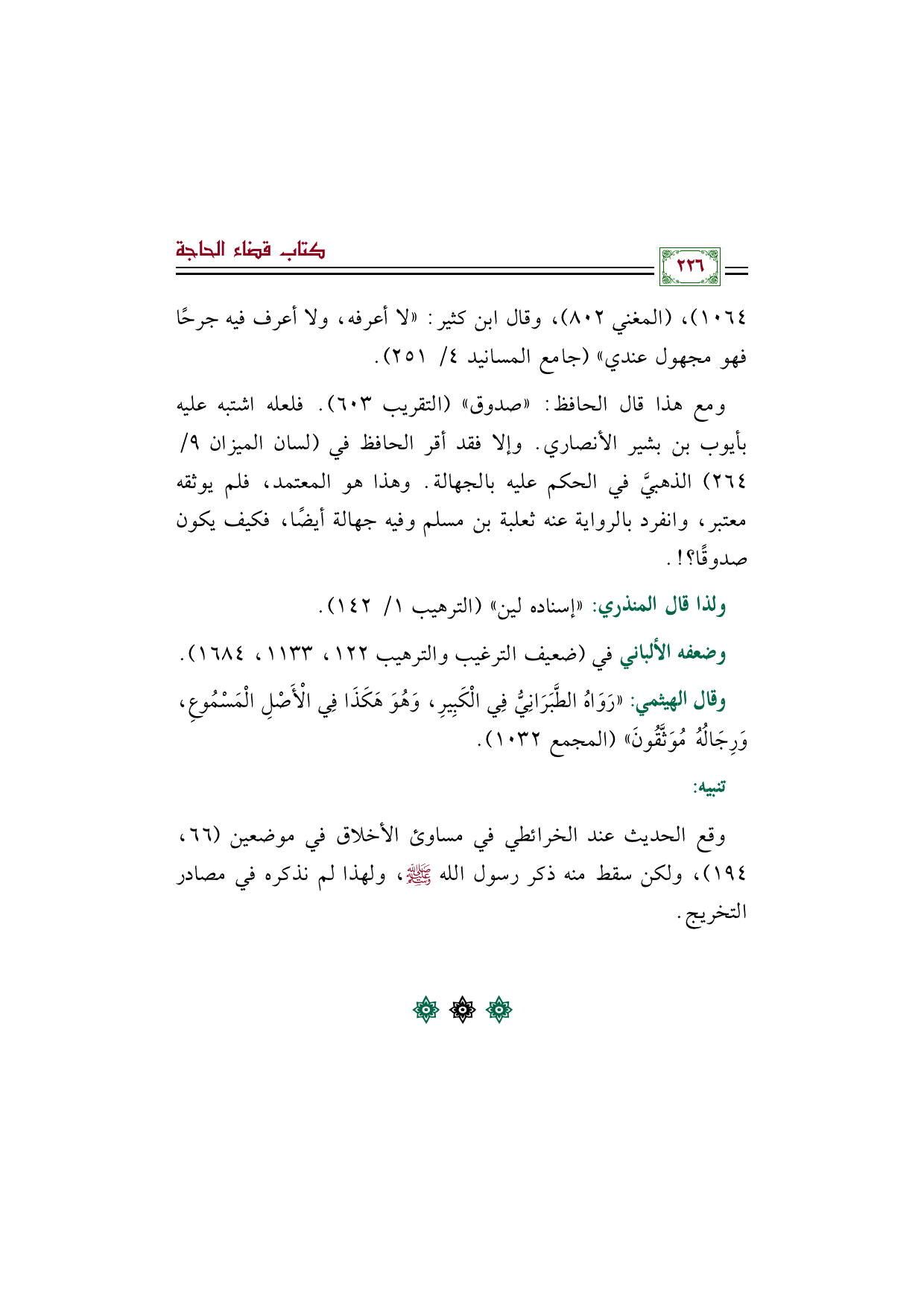 ومع هذا قال الحافظ: "صدوق" (التقريب ٦٠٣). فلعله اشتبه عليه بأيوب بن بشير الأنصاري. وإلا فقد أقر الحافظ في (لسان الميزان ٩/ ٢٦٤) الذهبيَّ في الحكم عليه بالجهالة. وهذا هو المعتمد، فلم يوثقه معتبر، وانفرد بالرواية عنه ثعلبة بن مسلم وفيه جهالة أيضًا، فكيف يكون صدوقًا؟!.