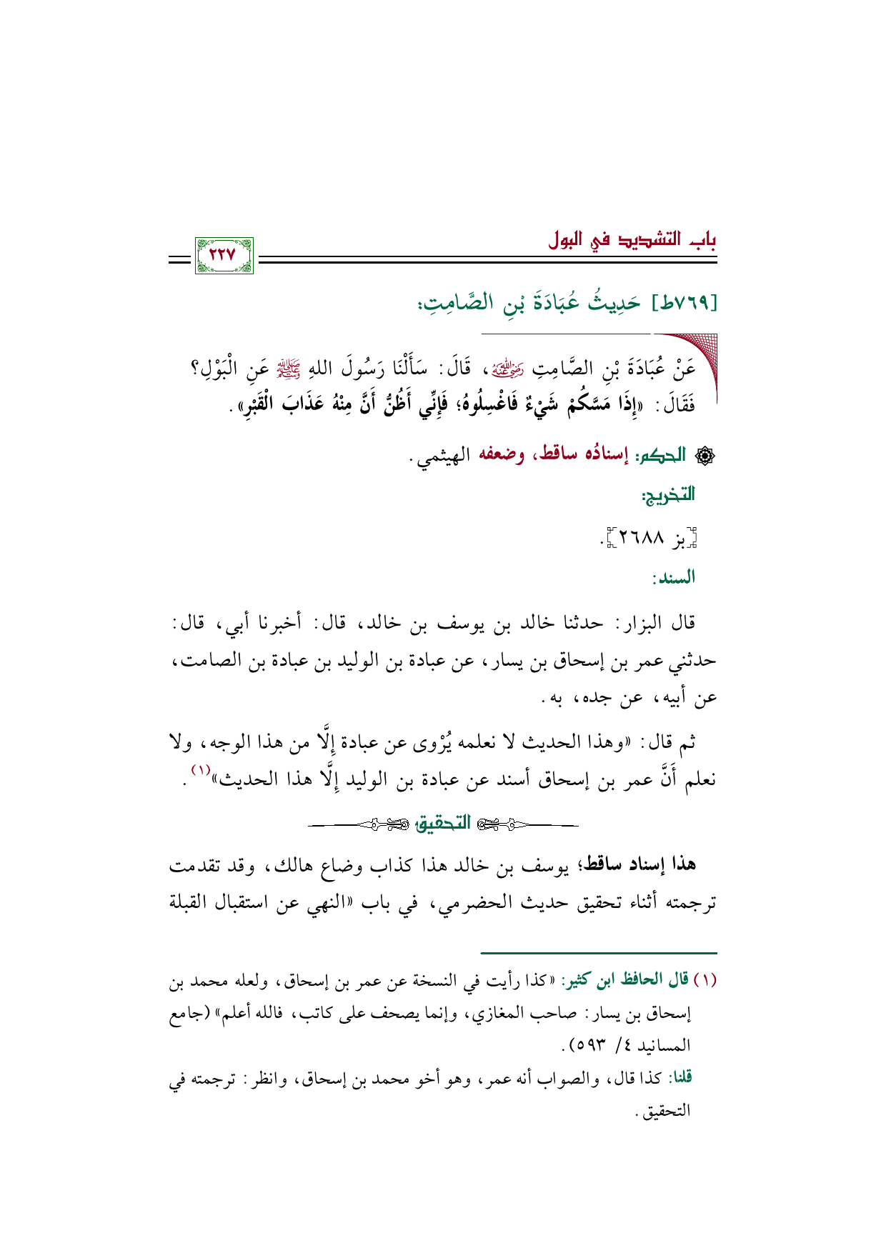 قال البزار: حدثنا خالد بن يوسف بن خالد، قال: أخبرنا أبي، قال: حدثني عمر بن إسحاق بن يسار، عن عبادة بن الوليد بن عبادة بن الصامت، عن أبيه، عن جده، به.