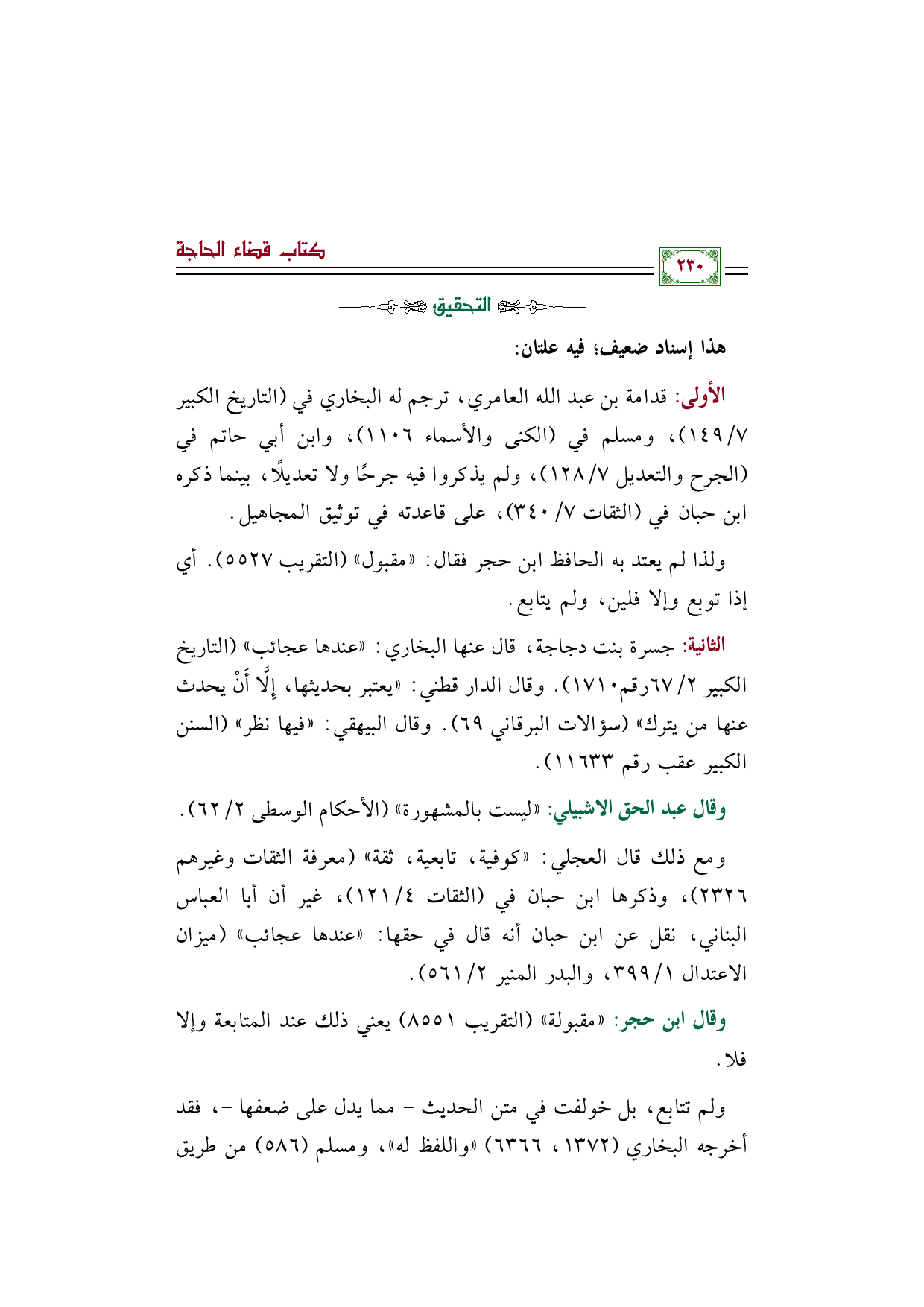 ولذا لم يعتد به الحافظ ابن حجر فقال: "مقبول" (التقريب ٥٥٢٧). أي إذا توبع وإلا فلين، ولم يتابع.