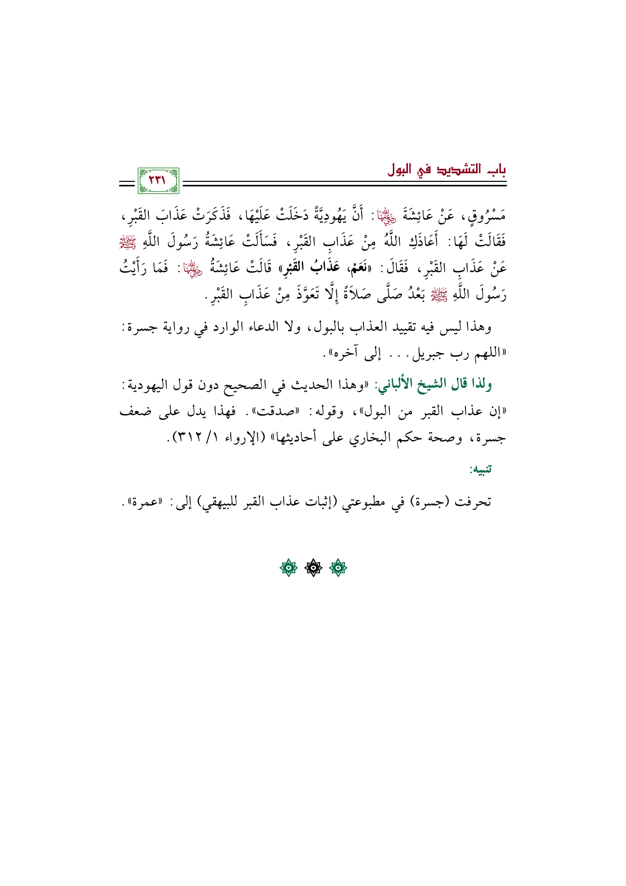 ولذا قال الشيخ الألباني: "وهذا الحديث في الصحيح دون قول اليهودية: «إن عذاب القبر من البول»، وقوله: «صدقت». فهذا يدل على ضعف جسرة، وصحة حكم البخاري على أحاديثها" (الإرواء ١/ ٣١٢).