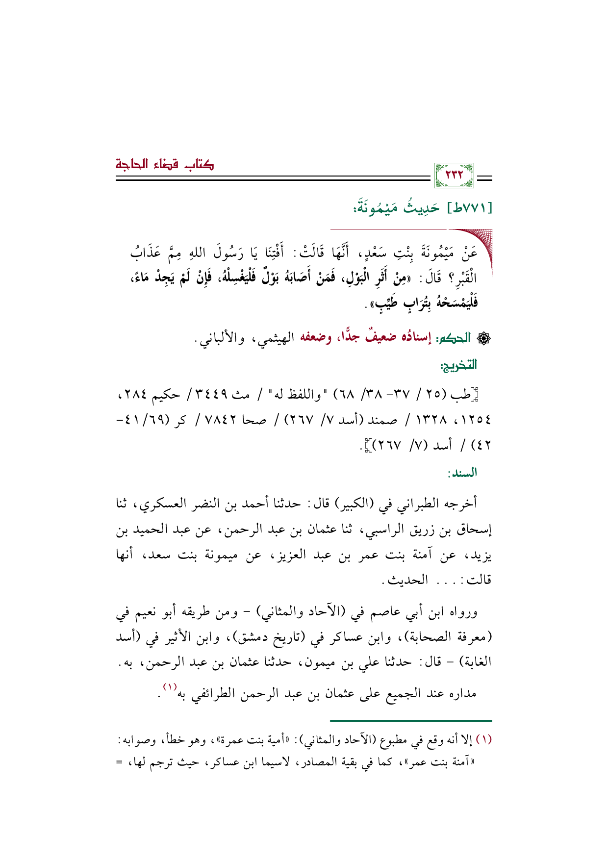 أخرجه الطبراني في (الكبير) قال: حدثنا أحمد بن النضر العسكري، ثنا إسحاق بن زريق الراسبي، ثنا عثمان بن عبد الرحمن، عن عبد الحميد بن يزيد، عن آمنة بنت عمر بن عبد العزيز، عن ميمونة بنت سعد، أنها قالت: ... الحديث.