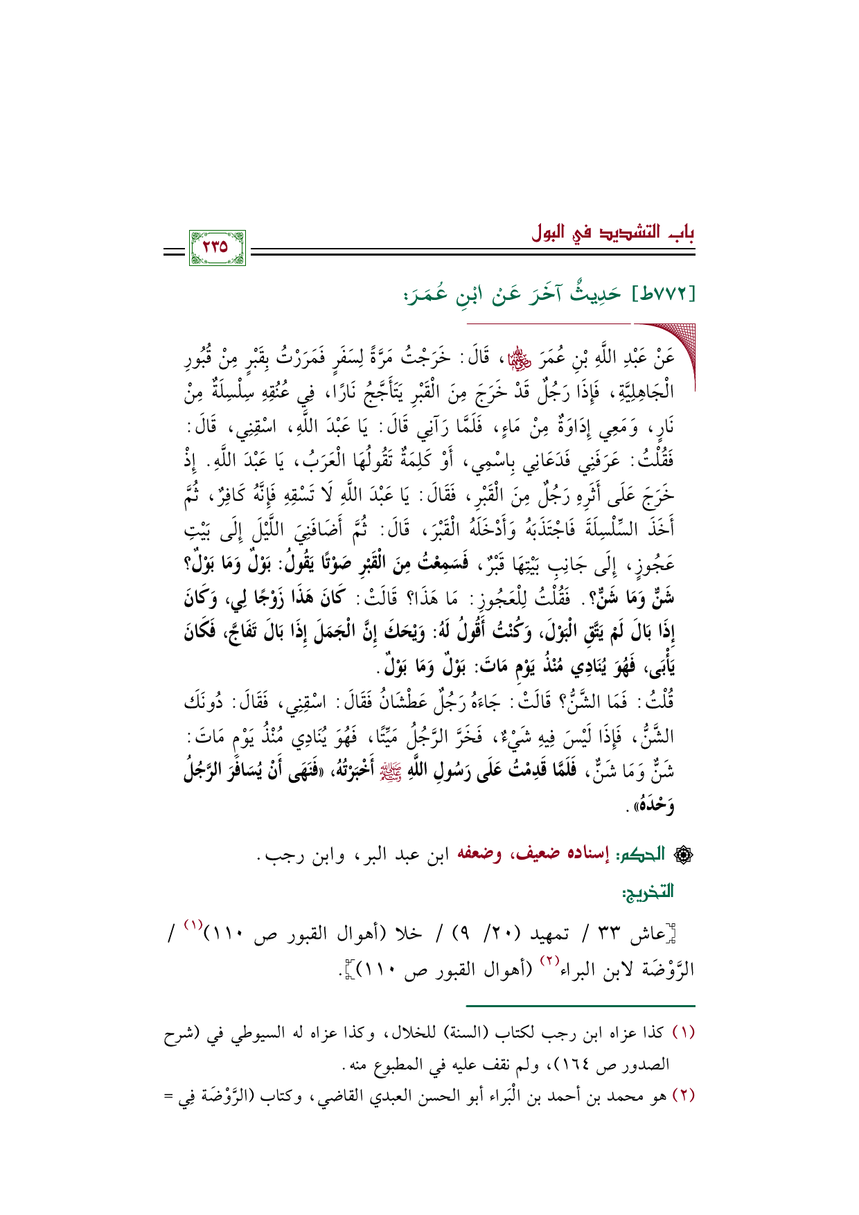 ◼ عَنْ عَبْدِ اللَّهِ بْنِ عُمَرَ رضي الله عنهما، قَالَ: خَرَجْتُ مَرَّةً لِسَفَرٍ فَمَرَرْتُ بِقَبْرٍ مِنْ قُبُورِ الْجَاهِلِيَّةِ، فَإِذَا رَجُلٌ قَدْ خَرَجَ مِنَ الْقَبْرِ يَتَأَجَّجُ نَارًا، فِي عُنُقِهِ سِلْسِلَةٌ مِنْ نَارٍ، وَمَعِي إِدَاوَةٌ مِنْ مَاءٍ، فَلَمَّا رَآنِي قَالَ: يَا عَبْدَ اللَّهِ، اسْقِنِي، قَالَ: فَقُلْتُ: عَرَفَنِي فَدَعَانِي بِاسْمِي، أَوْ كَلِمَةٌ تَقُولُهَا الْعَرَبُ، يَا عَبْدَ اللَّهِ. إِذْ خَرَجَ عَلَى أَثَرِهِ رَجُلٌ مِنَ الْقَبْرِ، فَقَالَ: يَا عَبْدَ اللَّهِ لَا تَسْقِهِ فَإِنَّهُ كَافِرٌ، ثُمَّ أَخَذَ السِّلْسِلَةَ فَاجْتَذَبَهُ وَأَدْخَلَهُ الْقَبْرَ، قَالَ: ثُمَّ أَضَافَنِيَ اللَّيْلَ إِلَى بَيْتِ عَجُوزٍ، إِلَى جَانِبِ بَيْتِهَا قَبْرٌ، فَسَمِعْتُ مِنَ الْقَبْرِ صَوْتًا يَقُولُ: بَوْلٌ وَمَا بَوْلٌ؟ شَنٌّ وَمَا شَنٌّ؟ . فَقُلْتُ لِلْعَجُوزِ: مَا هَذَا؟ قَالَتْ: كَانَ هَذَا زَوْجًا لِي، وَكَانَ إِذَا بَالَ لَمْ يَتَّقِ الْبَوْلَ، وَكُنْتُ أَقُولُ لَهُ: وَيْحَكَ إِنَّ الْجَمَلَ إِذَا بَالَ تَفَاجَّ، فَكَانَ يَأْبَى، فَهُوَ يُنَادِي مُنْذُ يَوْمِ مَاتَ: بَوْلٌ وَمَا بَوْلٌ.