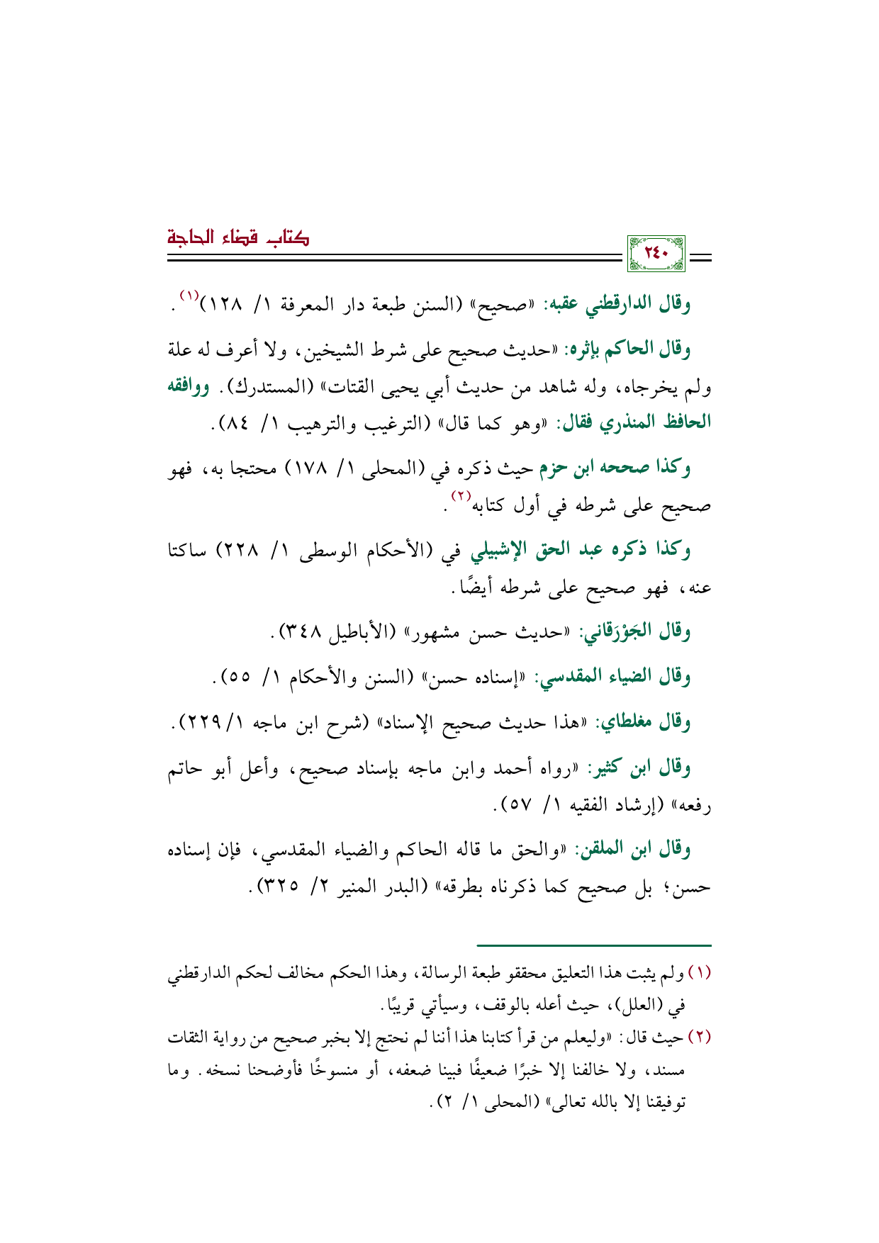 وقال الضياء المقدسي: "إسناده حسن" (السنن والأحكام ١/ ٥٥).