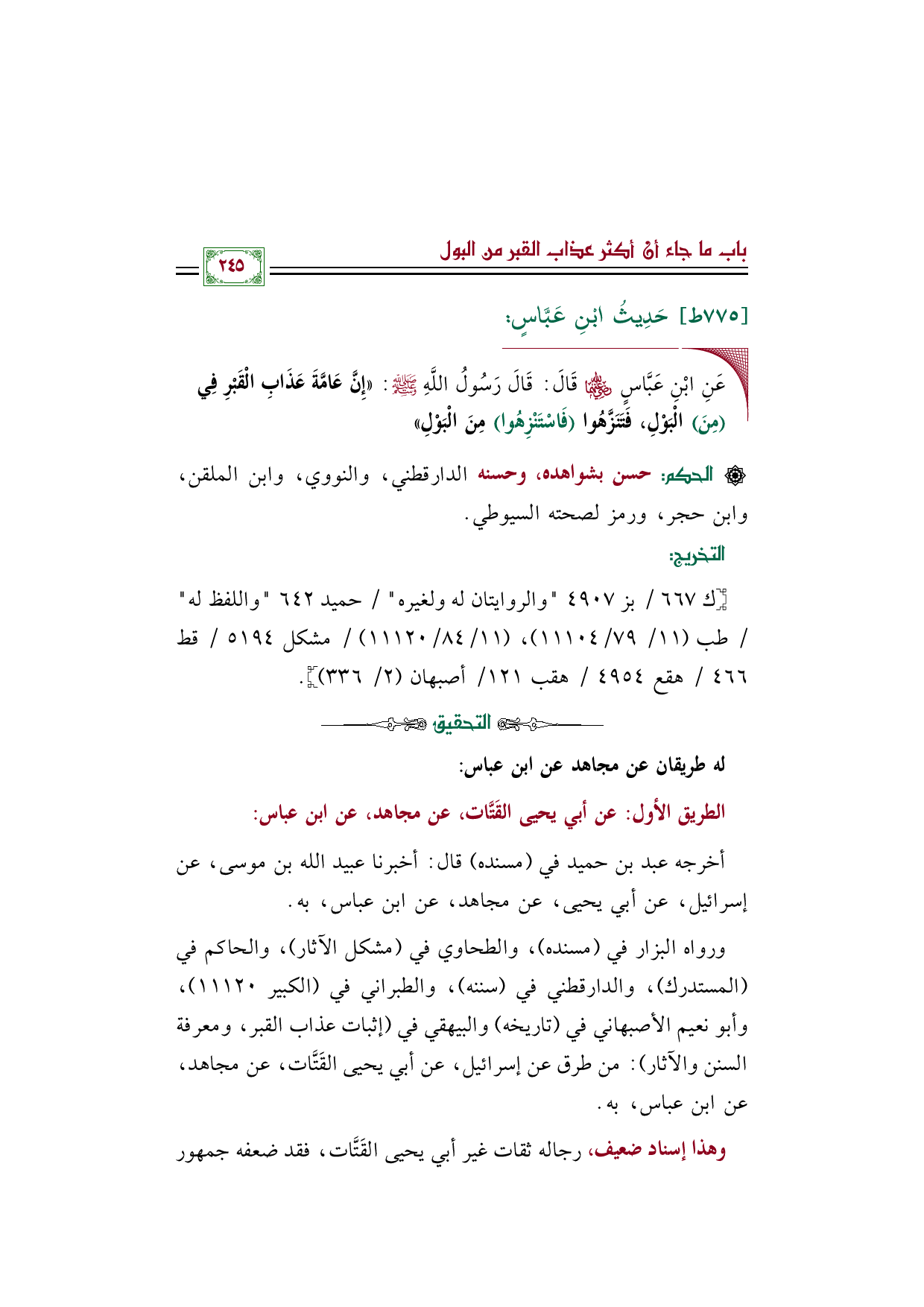 ورواه البزار في (مسنده)، والطحاوي في (مشكل الآثار)، والحاكم في (المستدرك)، والدارقطني في (سننه)، والطبراني في (الكبير ١١١٢٠)، وأبو نعيم الأصبهاني في (تاريخه) والبيهقي في (إثبات عذاب القبر، ومعرفة السنن والآثار): من طرق عن إسرائيل، عن أبي يحيى القَتَّات، عن مجاهد، عن ابن عباس، به.