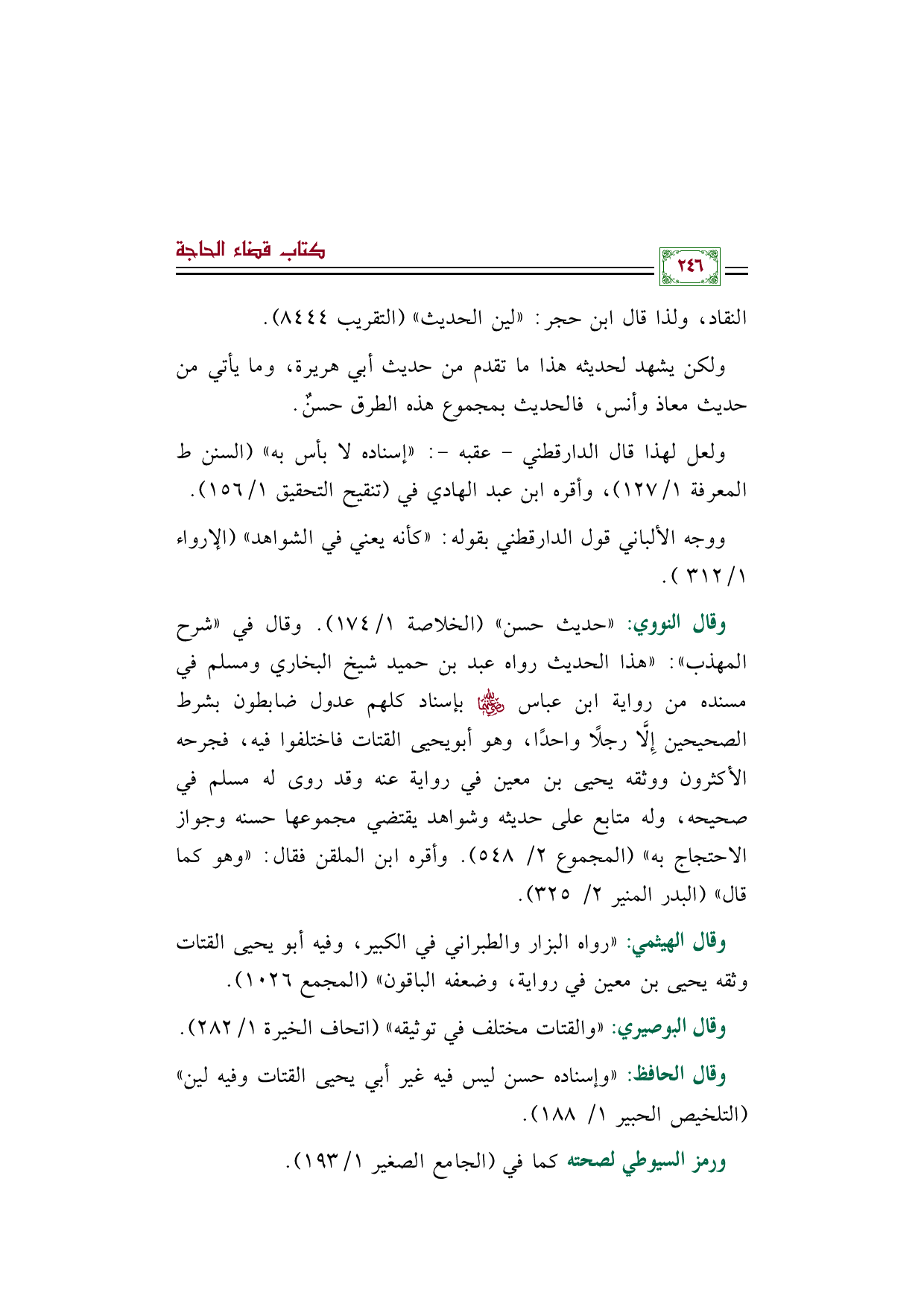 وقال النووي: "حديث حسن" (الخلاصة ١/ ١٧٤). وقال في «شرح المهذب»: "هذا الحديث رواه عبد بن حميد شيخ البخاري ومسلم في مسنده من رواية ابن عباس رضي الله عنهما بإسناد كلهم عدول ضابطون بشرط الصحيحين إِلَّا رجلًا واحدًا، وهو أبويحيى القتات فاختلفوا فيه، فجرحه الأكثرون ووثقه يحيى بن معين في رواية عنه وقد روى له مسلم في صحيحه، وله متابع على حديثه وشواهد يقتضي مجموعها حسنه وجواز الاحتجاج به" (المجموع ٢/ ٥٤٨). وأقره ابن الملقن فقال: "وهو كما قال" (البدر المنير ٢/ ٣٢٥).