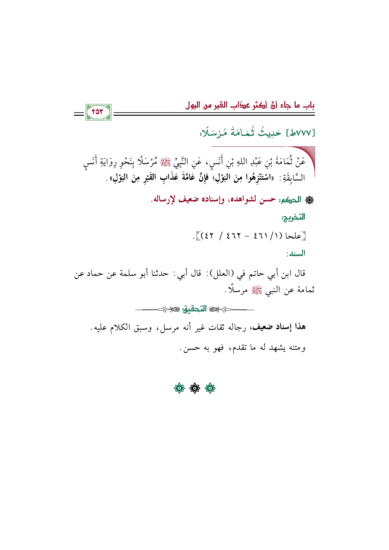 ◼ عَنْ ثُمَامَةَ بْنِ عَبْدِ اللهِ بْنِ أَنَسٍ، عَنِ النَّبِيِّ صلى الله عليه وسلم مُرْسَلًا بِنَحْوِ رِوَايَةِ أَنَسٍ السَّابِقَةِ: «اسْتَنْزِهُوا مِنَ البَوْلِ؛ فإِنَّ عَامَّةَ عَذَابِ القَبْرِ مِنَ البَوْلِ».