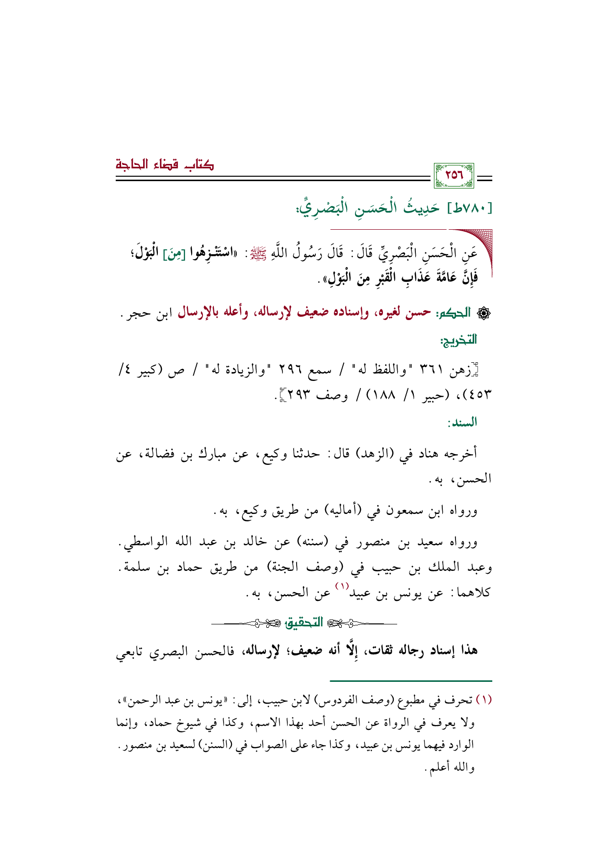 (¬١) تحرف في مطبوع (وصف الفردوس) لابن حبيب، إلى: "يونس بن عبد الرحمن"، ولا يعرف في الرواة عن الحسن أحد بهذا الاسم، وكذا في شيوخ حماد، وإنما الوارد فيهما يونس بن عبيد، وكذا جاء على الصواب في (السنن) لسعيد بن منصور. والله أعلم.