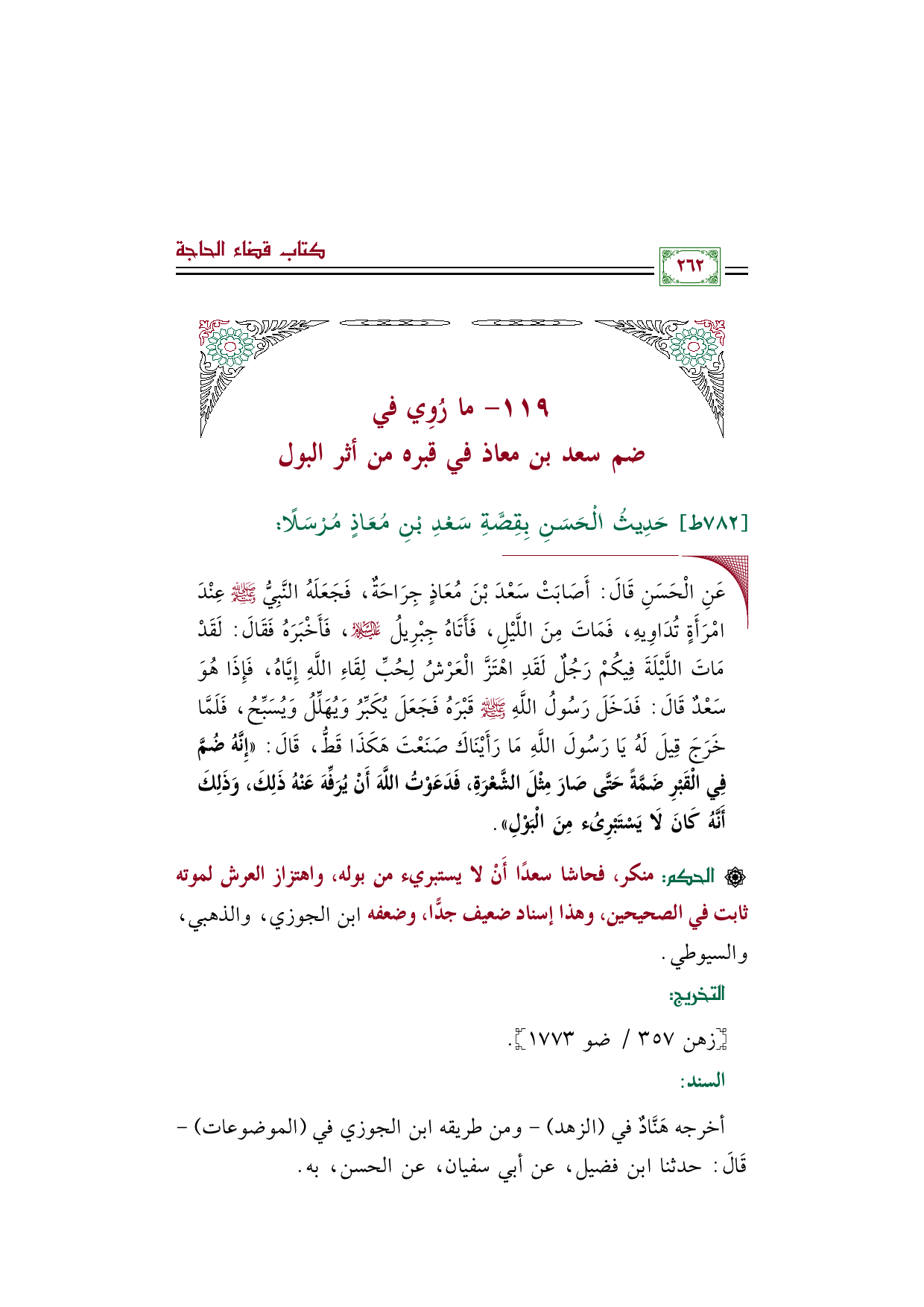 ◼ عَنِ الْحَسَنِ قَالَ: أَصَابَتْ سَعْدَ بْنَ مُعَاذٍ جِرَاحَةٌ، فَجَعَلَهُ النَّبِيُّ صلى الله عليه وسلم عِنْدَ امْرَأَةٍ تُدَاوِيهِ، فَمَاتَ مِنَ اللَّيْلِ، فَأَتَاهُ جِبْرِيلُ عليه السلام، فَأَخْبَرَهُ فَقَالَ: لَقَدْ مَاتَ اللَّيْلَةَ فِيكُمْ رَجُلٌ لَقَدِ اهْتَزَّ الْعَرْشُ لِحُبِّ لِقَاءِ اللَّهِ إِيَّاهُ، فَإِذَا هُوَ سَعْدٌ قَالَ: فَدَخَلَ رَسُولُ اللَّهِ صلى الله عليه وسلم قَبْرَهُ فَجَعَلَ يُكَبِّرُ وَيُهَلِّلُ وَيُسَبِّحُ، فَلَمَّا خَرَجَ قِيلَ لَهُ يَا رَسُولَ اللَّهِ مَا رَأَيْنَاكَ صَنَعْتَ هَكَذَا قَطُّ، قَالَ: «إِنَّهُ ضُمَّ فِي الْقَبْرِ ضَمَّةً حَتَّى صَارَ مِثْلَ الشَّعْرَةِ، فَدَعَوْتُ اللَّهَ أَنْ يُرَفِّهَ عَنْهُ ذَلِكَ، وَذَلِكَ أَنَّهُ كَانَ لَا يَسْتَبْرِىُء مِنَ الْبَوْلِ».