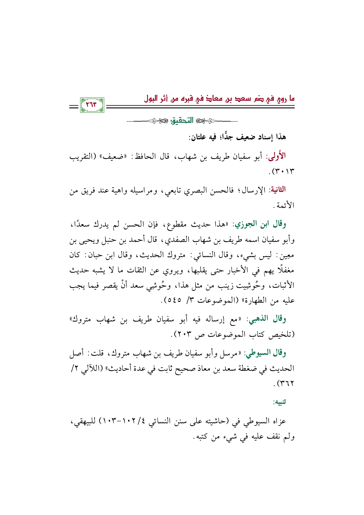 وقال ابن الجوزي: "هذا حديث مقطوع، فإن الحسن لم يدرك سعدًا، وأبو سفيان اسمه طريف بن شهاب الصفدي، قال أحمد بن حنبل ويحيى بن معِين: ليس بشيء، وقال النسائي: متروك الحديث، وقال ابن حبان: كان مغفلًا يهم في الأخبار حتى يقلبها، ويروي عن الثقات ما لا يشبه حديث الأثبات، وحُوشِيت زينب من مثل هذا، وحُوشِي سعد أنْ يقصر فيما يجب عليه من الطهارة" (الموضوعات ٣/ ٥٤٥).