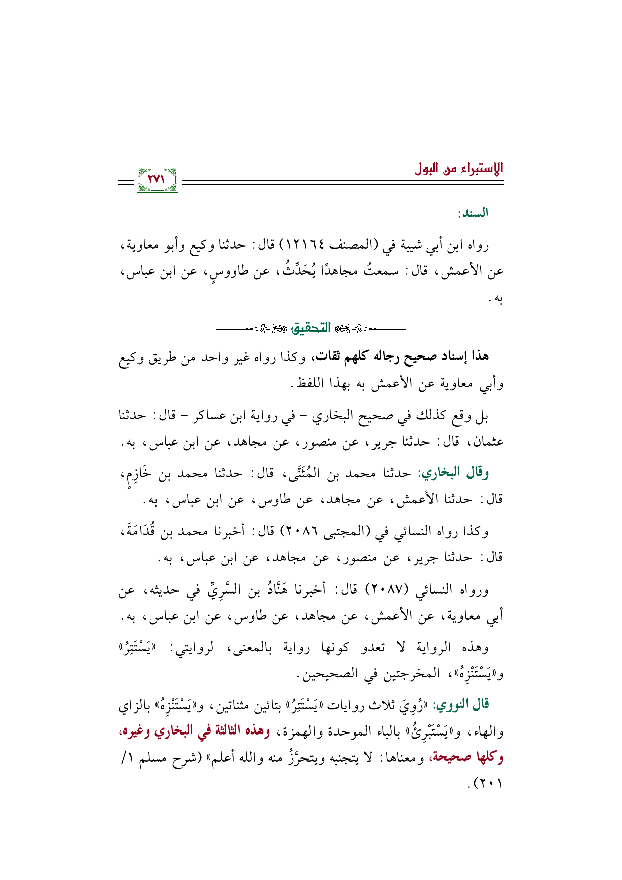 قال النووي: "رُوِيَ ثلاث روايات (يَسْتَتِرُ) بتائين مثناتين، و (يَسْتَنْزِهُ) بالزاي والهاء، و (يَسْتَبْرِئُ) بالباء الموحدة والهمزة، وهذه الثالثة في البخاري وغيره، وكلها صحيحة، ومعناها: لا يتجنبه ويتحرَّزُ منه والله أعلم" (شرح مسلم ١/ ٢٠١).