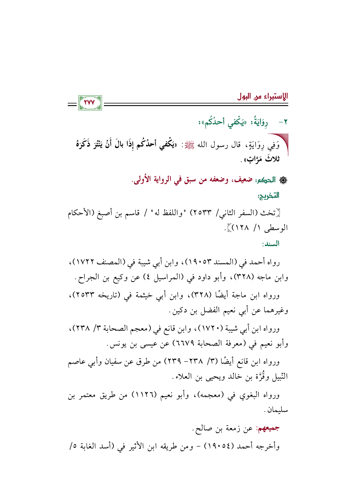• وَفِي رِوَايَةٍ، قال رسول الله صلى الله عليه وسلم: «يَكْفي أحدُكُم إِذَا بالَ أَنْ يَنْتُرَ ذَكَرَهُ ثلاثَ مَرَّاتٍ».