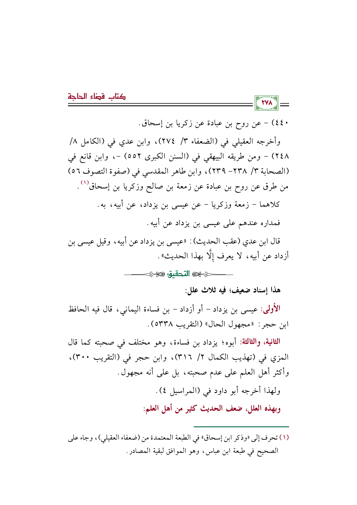 وأخرجه العقيلي في (الضعفاء ٣/ ٢٧٤)، وابن عدي في (الكامل ٨/ ٢٤٨) - ومن طريقه البيهقي في (السنن الكبرى ٥٥٢) -، وابن قانع في (الصحابة ٣/ ٢٣٨ - ٢٣٩)، وابن طاهر المقدسي في (صفوة التصوف ٥٦) من طرق عن روح بن عبادة عن زمعة بن صالح وزكريا بن إسحاق (¬١).