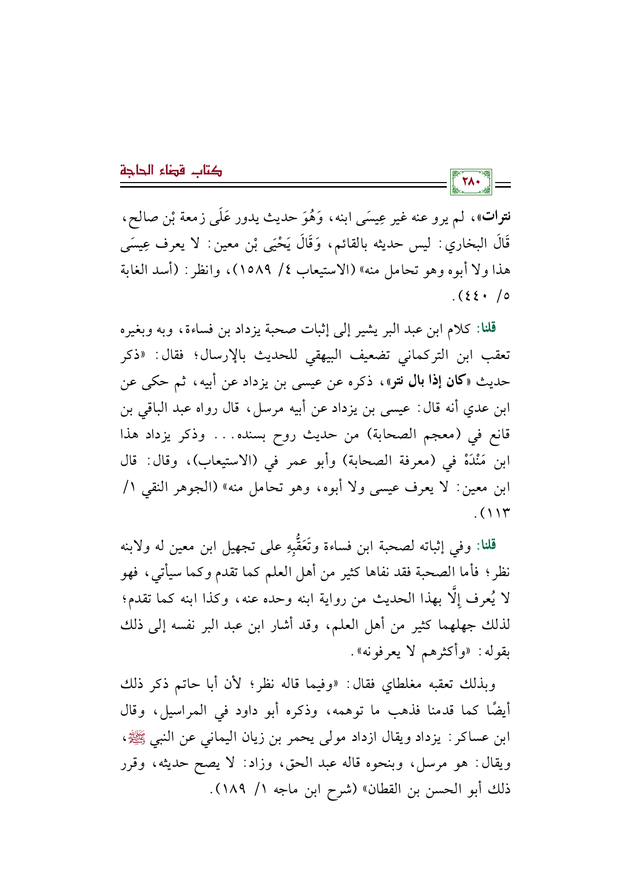 قلنا: كلام ابن عبد البر يشير إلى إثبات صحبة يزداد بن فساءة، وبه وبغيره تعقب ابن التركماني تضعيف البيهقي للحديث بالإرسال؛ فقال: "ذكر حديث «كان إذا بال نتر»، ذكره عن عيسى بن يزداد عن أبيه، ثم حكى عن ابن عدي أنه قال: عيسى بن يزداد عن أبيه مرسل، قال رواه عبد الباقي بن قانع في (معجم الصحابة) من حديث روح بسنده ... وذكر يزداد هذا ابن مَنْدَهْ في (معرفة الصحابة) وأبو عمر في (الاستيعاب)، وقال: قال ابن معين: لا يعرف عيسى ولا أبوه، وهو تحامل منه" (الجوهر النقي ١/ ١١٣).