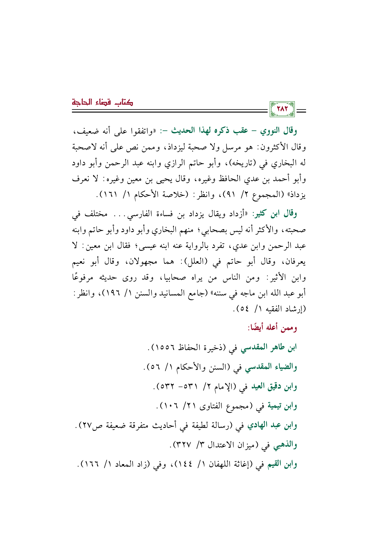 وقال النووي- عقب ذكره لهذا الحديث-: "واتفقوا على أنه ضعيف، وقال الأكثرون: هو مرسل ولا صحبة ليزداذ، وممن نص على أنه لاصحبة له البخاري في (تاريخه)، وأبو حاتم الرازي وابنه عبد الرحمن وأبو داود وأبو أحمد بن عدي الحافظ وغيره، وقال يحيى بن معين وغيره: لا نعرف يزداذ" (المجموع ٢/ ٩١)، وانظر: (خلاصة الأحكام ١/ ١٦١).