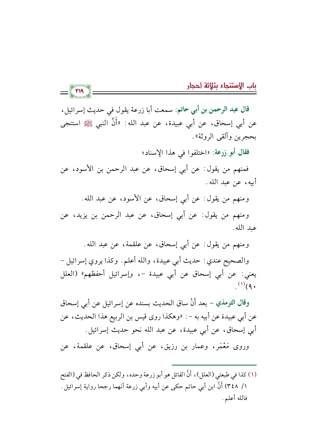 قال عبد الرحمن بن أبي حاتم: سمعت أبا زرعة يقول في حديث إسرائيل، عن أبي إسحاق، عن أبي عبيدة، عن عبد الله: «أَنَّ النبي صلى الله عليه وسلم استنجى بحجرين وألقى الروثة».