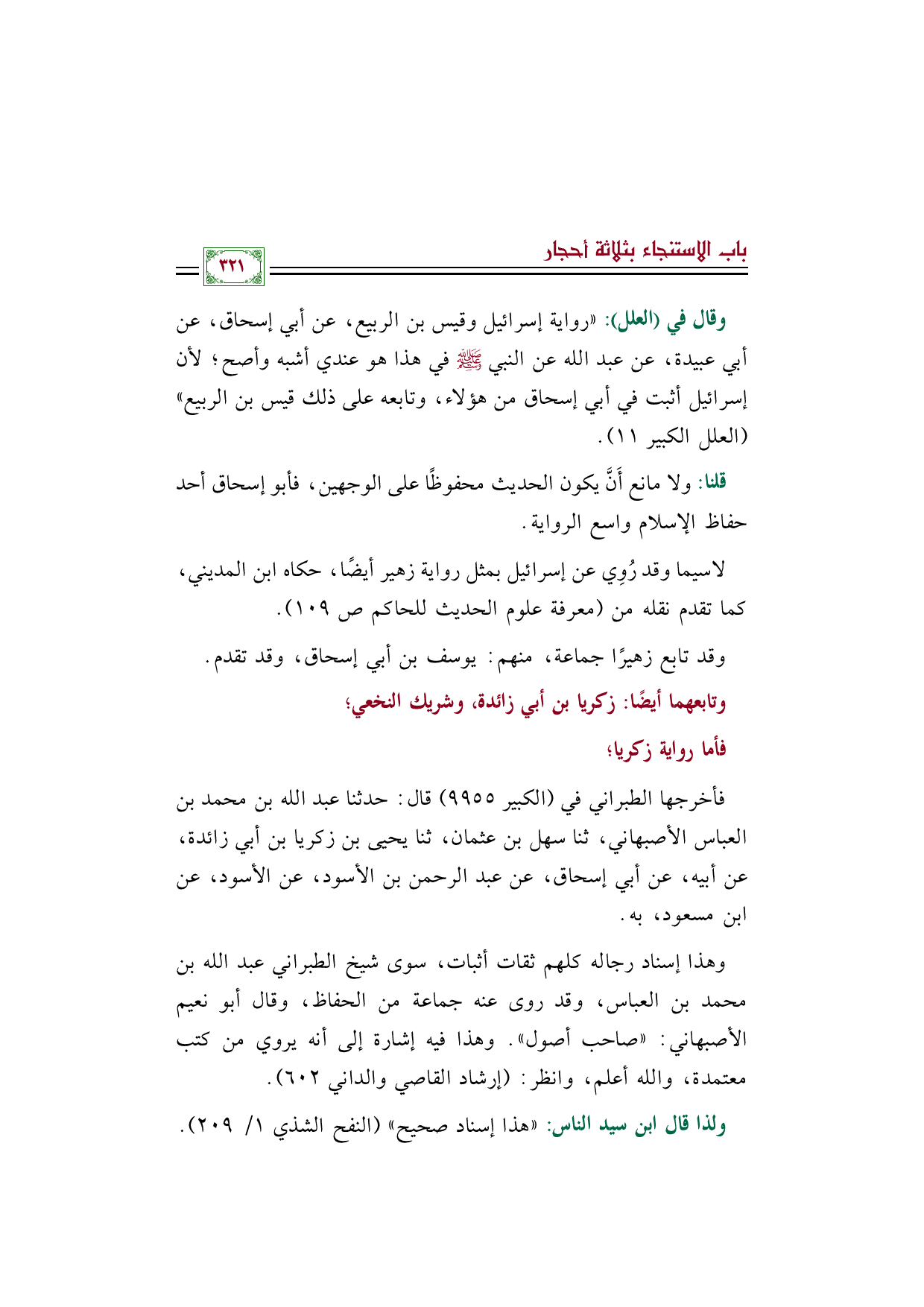 وقال في (العلل): "رواية إسرائيل وقيس بن الربيع، عن أبي إسحاق، عن أبي عبيدة، عن عبد الله عن النبي صلى الله عليه وسلم في هذا هو عندي أشبه وأصح؛ لأن إسرائيل أثبت في أبي إسحاق من هؤلاء، وتابعه على ذلك قيس بن الربيع" (العلل الكبير ١١).