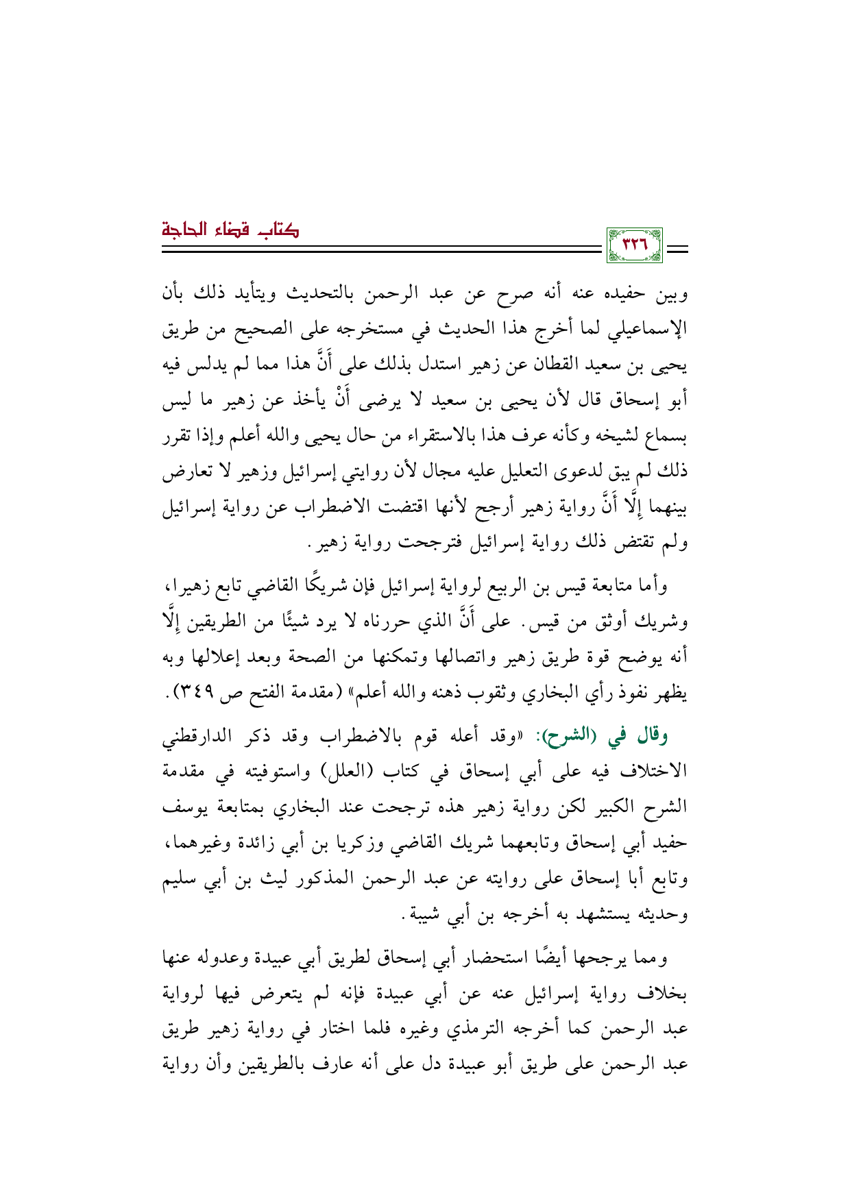 ومما يرجحها أيضًا استحضار أبي إسحاق لطريق أبي عبيدة وعدوله عنها بخلاف رواية إسرائيل عنه عن أبي عبيدة فإنه لم يتعرض فيها لرواية عبد الرحمن كما أخرجه الترمذي وغيره فلما اختار في رواية زهير طريق عبد الرحمن على طريق أبو عبيدة دل على أنه عارف بالطريقين وأن رواية