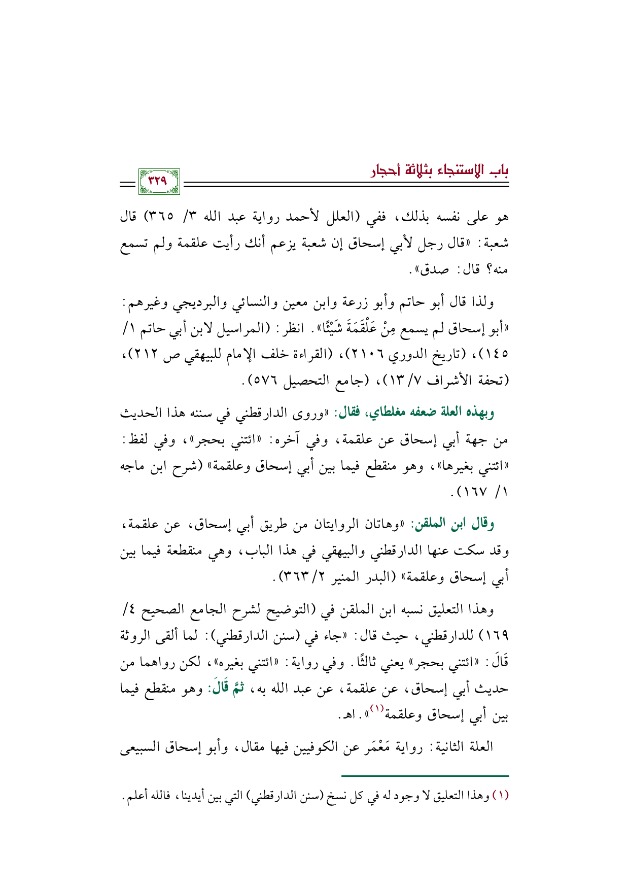 وبهذه العلة ضعفه مغلطاي، فقال: "وروى الدارقطني في سننه هذا الحديث من جهة أبي إسحاق عن علقمة، وفي آخره: "ائتني بحجر"، وفي لفظ: "ائتني بغيرها"، وهو منقطع فيما بين أبي إسحاق وعلقمة" (شرح ابن ماجه ١/ ١٦٧).
